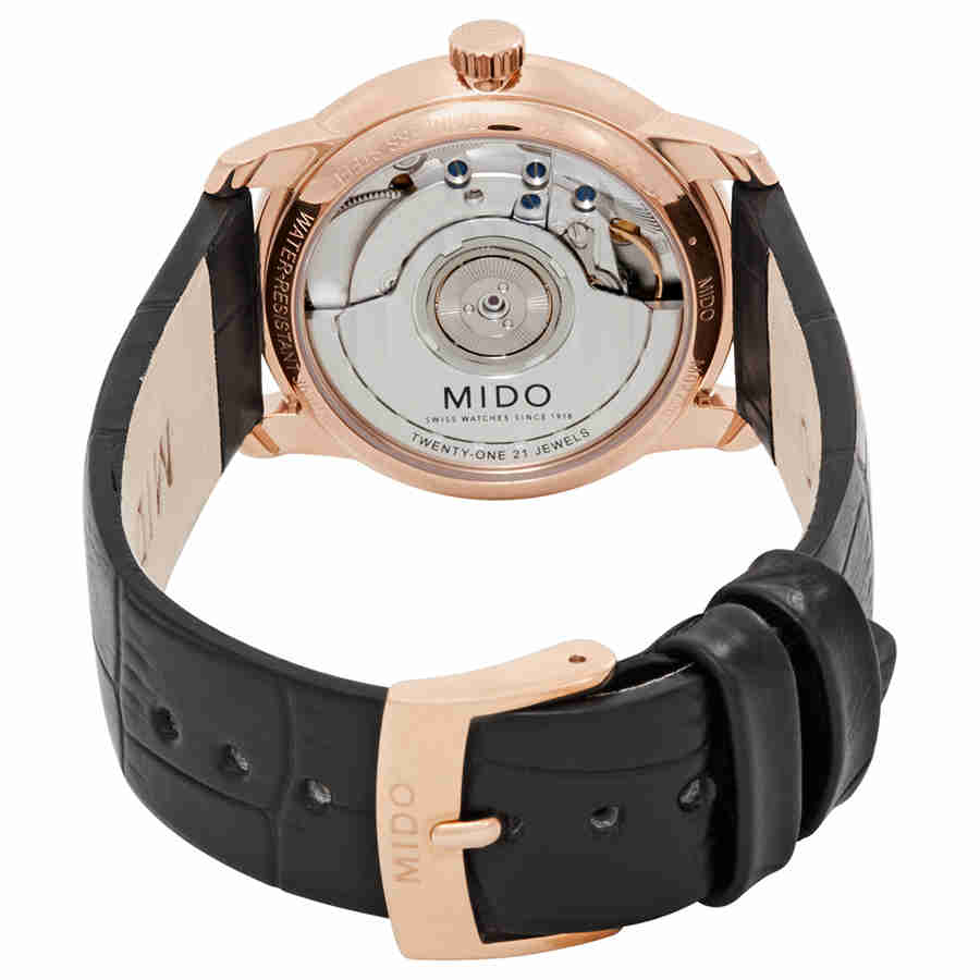 Rose gold PVD stainless steel case with a black leather strap. Fixed rose gold PVD bezel. Silver dial with rose gold-tone hands and Roman numeral hour markers. Dial Type: Analog. Date display at the 3 o'clock position. ETA 2892-A2 automatic movement with a 42-hour power reserve. Scratch resistant sapphire crystal. Pull / push crown. Transparent case back. Round case shape. Case size: 33 mm. Case thickness: 6.85 mm. Band width: 17 mm. Fold over clasp with a push button release. Water resistant at 30 meters / 100 feet. Functions: date, hour, minute, second. Casual watch style. Mido Baroncelli III Automatic Silver Dial Ladies Watch M0272073601300.