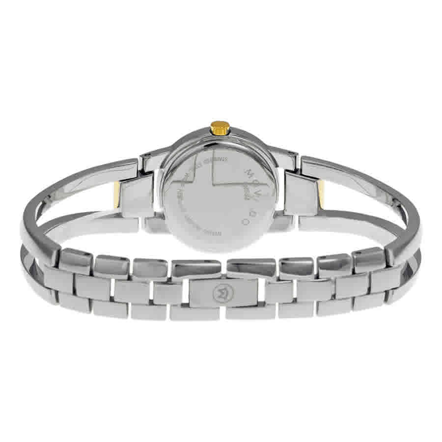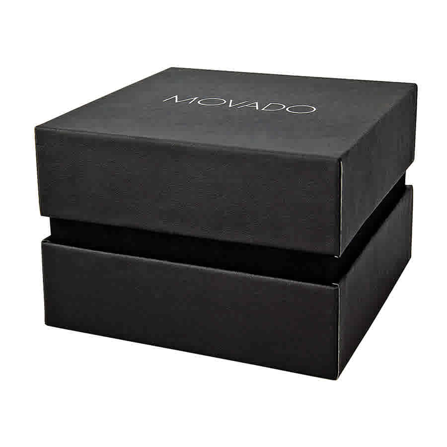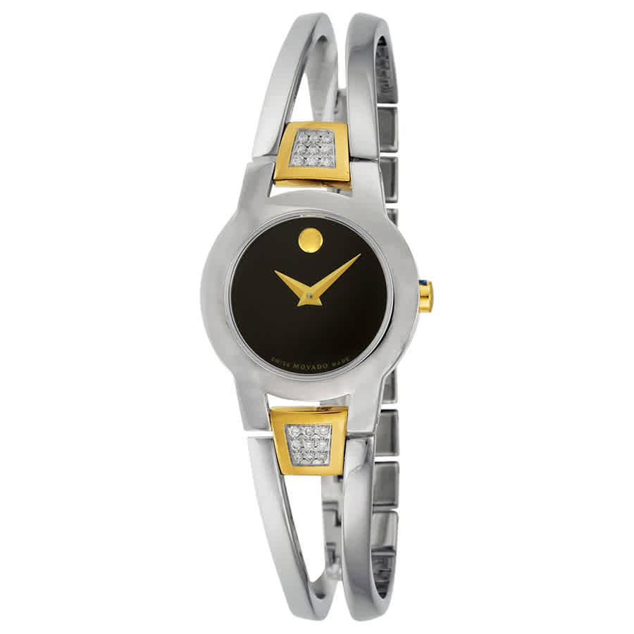 Silver-tone stainless steel case with a two-tone (silver-tone and gold-tone) stainless steel bracelet. Fixed silver-tone stainless steel bezel. Black dial with gold tone hands. No markers. the signature movado dot appears at the 12 o'clock position. Dial Type: Analog. Luminescent hands and dial markers. Quartz movement. Scratch resistant sapphire crystal. Pull / push crown. Solid case back. Round case shape, case size: 23.5 mm, case thickness: 5 mm. Band width: 8 mm. Jewelry clasp. Water resistant at 30 meters / 100 feet. Functions: hours, minutes. Fashion watch style. Watch label: Swiss Made. Item Variations: 604983, 0604983, Movado-604983, Movado-0604983 604983, 0604983, Movado-604983, M. Movado Amorosa Quartz Black Dial Ladies Watch 0604983.