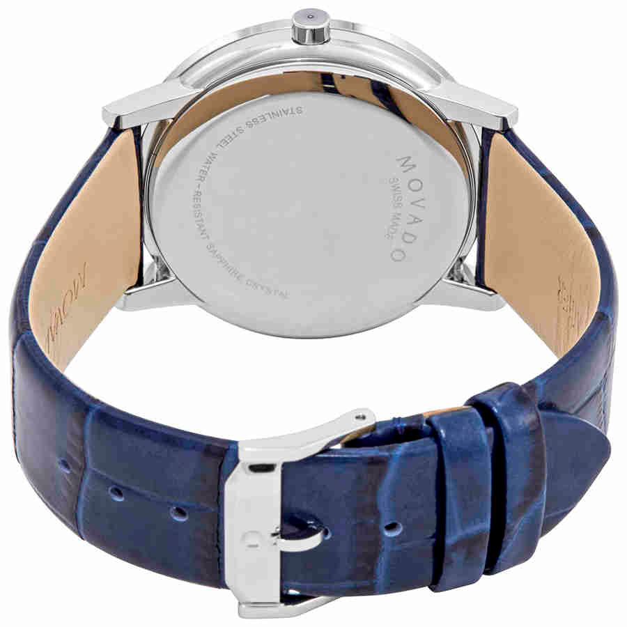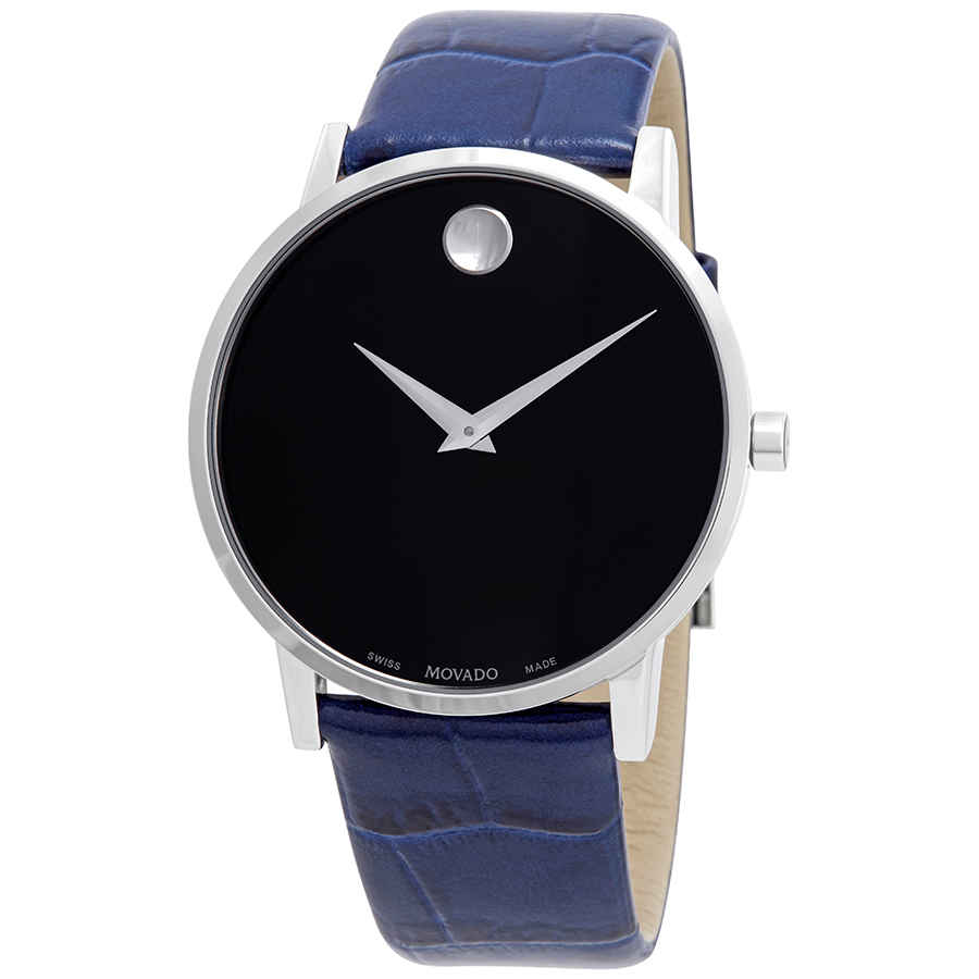 Stainless steel case with a blue leather strap. Fixed stainless steel bezel. Black dial with silver-tone hands. No markers. movado dot appears at the 12 o'clock position. Dial Type: Analog. Quartz...