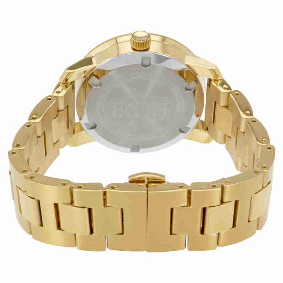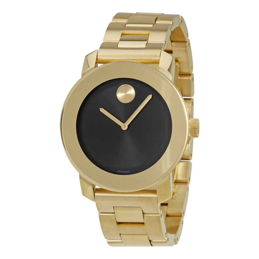 Yellow gold PVD stainless steel case and bracelet. Fixed yellow gold PVD bezel. Black dial with gold-tone hands. No markers. The Movado dot appears at the 12 o'clock poisition. Dial Type: Analog. Quartz movement. Scratch resistant K1 mineral crystal. Pull / push crown. Solid case back. Case size: 36 mm, case thickness: 9.2 mm. Round case shape. Band width: 20 mm. Deployment clasp with a push button release. Water resistant at 30 meters / 100 feet. Functions: hour, minute. Dress watch style. Movado Bold Black Dial Gold-tone Unisex Watch 3600397.