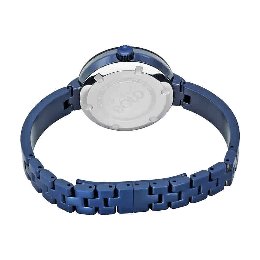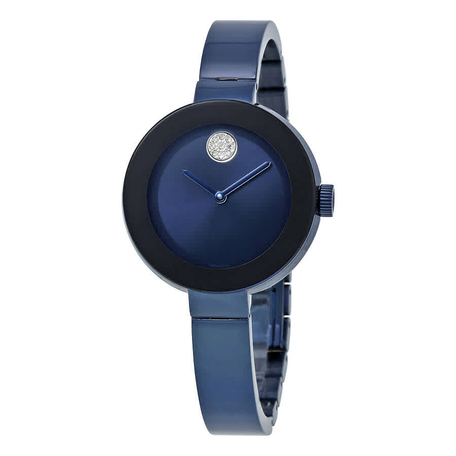 Blue ion-plated stainless steel case with a blue ion-plated stainless steel bracelet. Fixed blue ion-plated stainless steel bezel. Blue dial with silver-tone hands. No markers. crystal-set movado dot at the 12 o'clock position. Dial Type: digital. Quartz movement. Scratch resistant k1 mineral crystal. Pull / push crown. Solid case back. Round case shape. Case size: 32 mm. Fold over clasp. Water resistant at 30 meters / 100 feet. Functions: hour, minute. Additional Info: caribbean edition. Dress watch style. Watch label: Swiss Made. Movado Bold Blue Dial Ladies Watch 3600425.