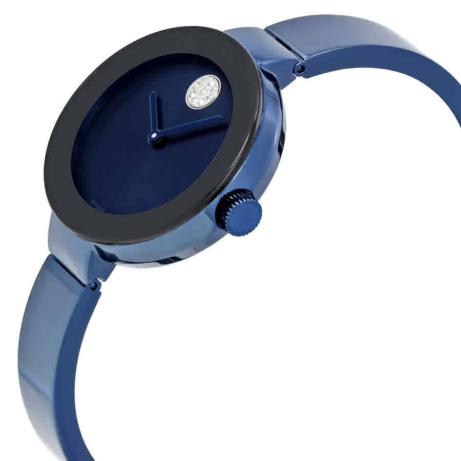 Blue ion-plated stainless steel case with a blue ion-plated stainless steel bracelet. Fixed blue ion-plated stainless steel bezel. Blue dial with silver-tone hands. No markers. crystal-set movado dot at the 12...