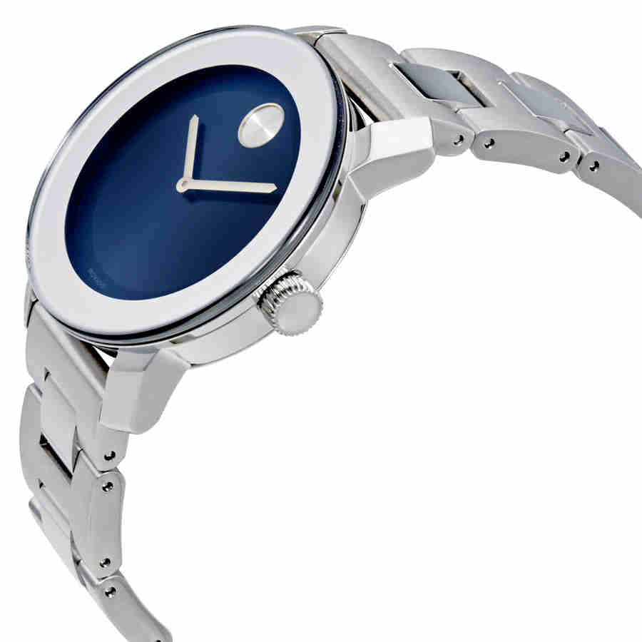 Stainless steel case with a stainless steel bracelet. Fixed stainless steel bezel. Blue dial with silver-tone hands. The Movado dot at the 12 o'clock position. Dial Type: Analog. Quartz movement. Scratch resistant K1 mineral crystal. Pull / push crown. Solid case back. Case size: 36 mm. Round case shape. Deployment clasp. Water resistant at 30 meters / 100 feet. Functions: hour, minute. Dress watch style. Movado Bold Blue Dial Stainless Steel Unisex Watch 3600396.