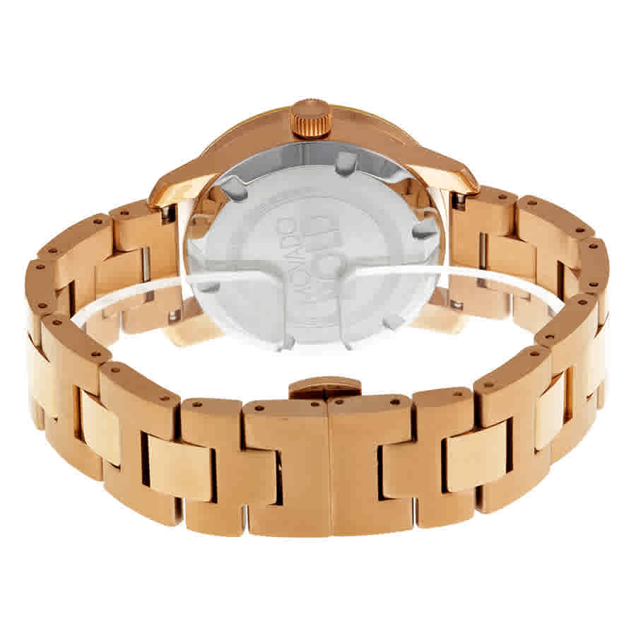 Rose gold ion-plated stainless steel case and bracelet. Fixed rose gold ion-plated bezel. Bronze dial with rose gold-tone hands. No markers. A crystal-set Movado dot appears at the 12 o'clock position....