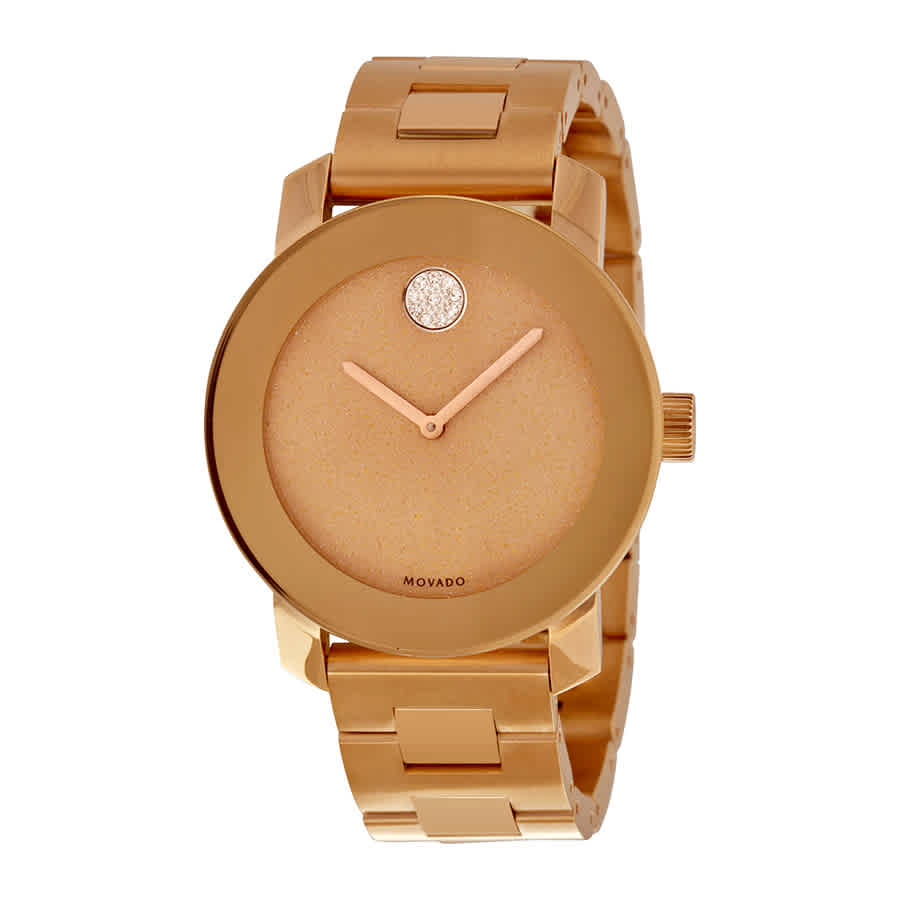 Rose gold ion-plated stainless steel case and bracelet. Fixed rose gold ion-plated bezel. Bronze dial with rose gold-tone hands. No markers. A crystal-set Movado dot appears at the 12 o'clock position. Dial Type: Analog. Quartz movement. Scratch resistant mineral crystal. Pull / push crown. Solid case back. Case diameter: 36 mm. Round case shape. Deployment clasp. Water resistant at 30 meters / 100 feet. Functions: hour, minute. Casual watch style. Movado Bold Bronze Dial Rose Gold Ion-plated Ladies Watch 3600335