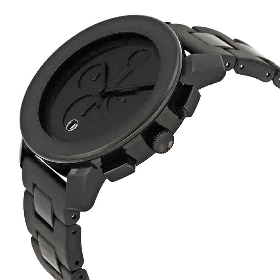 Black stainless steel case with a black TR90 resin bracelet. Fixed black TR90 bezel. Black dial with black hands. The signuture movardo dot appears at the 12 o'clock position. Dial Type: Analog. Date display at the 6 o'clock position. Chronograph - three sub-dials displaying: 60 second, 60 minute and 12 hour. Quartz movement. Scratch resistant mineral K1 crystal. Screw down crown. Solid case back. Case size: 43 mm. Case thickness: 14 mm. Round case shape. Band width: 22 mm. Band length: 9 inches. Deployment with push button release clasp. Water resistant at 30 meters / 100 feet. Functions: chronograph, date, hour, minute, second. Dress watch style. Watch label: Swiss Made. Movado Bold Chronograph Black Bracelet Mens Watch 3600048.