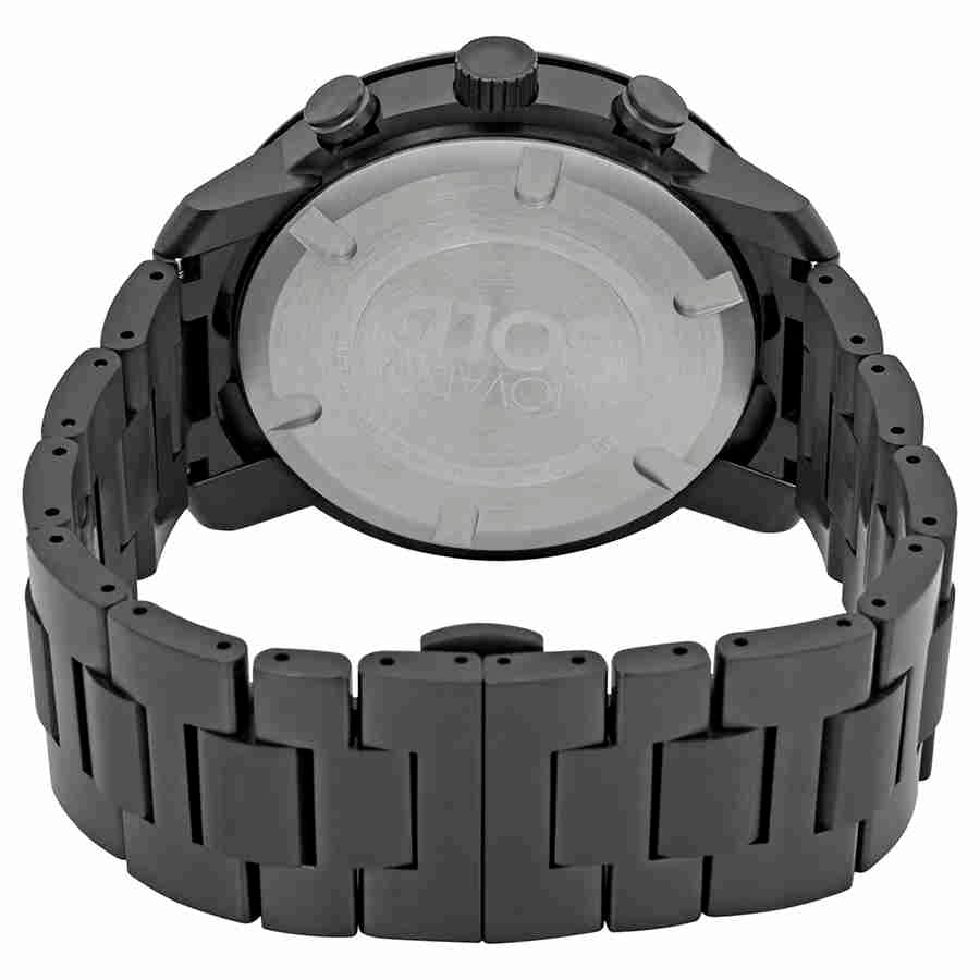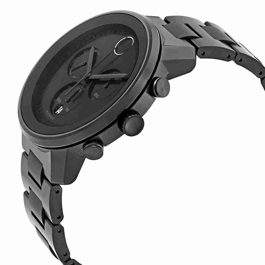Black ion-plated stainless steel case and bracelet. Fixed black ion-plated bezel. Black dial with black hands and index hour markers. Minute markers around the outer rim. The Movado dot appears at the 12 o'clock position. Dial Type: Analog. Date display at the 6 o'clock position. Chronograph - two sub-dials displaying: 60 second and 30 minute. Day of the week sub-dial. Quartz movement. Scratch resistant mineral K1 crystal. Pull / push crown. Solid case back. Round case shape. Case size: 48 mm. Case thickness: 11 mm. Band width: 20 mm. Deployment clasp with a push button release. Water resistant at 30 meters / 100 feet. Functions: chronograph, date, day of the week, hour, minute, second. Dress watch style. Movado Bold Chronograph Black Dial Mens Watch 3600484.