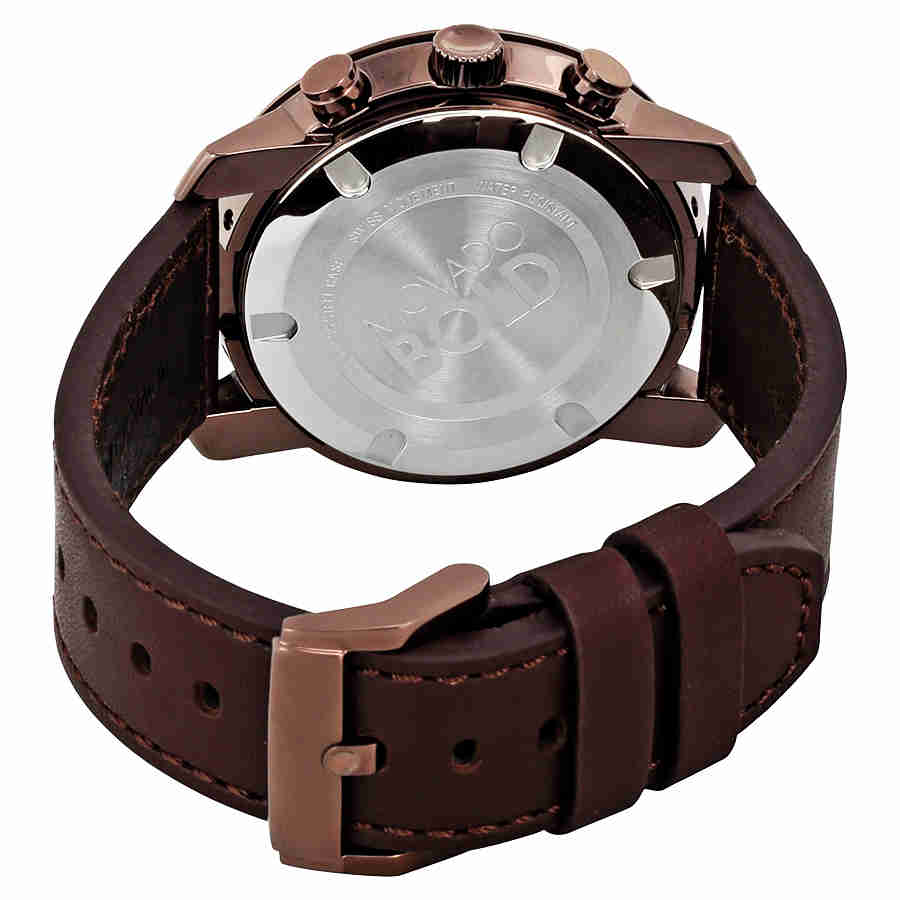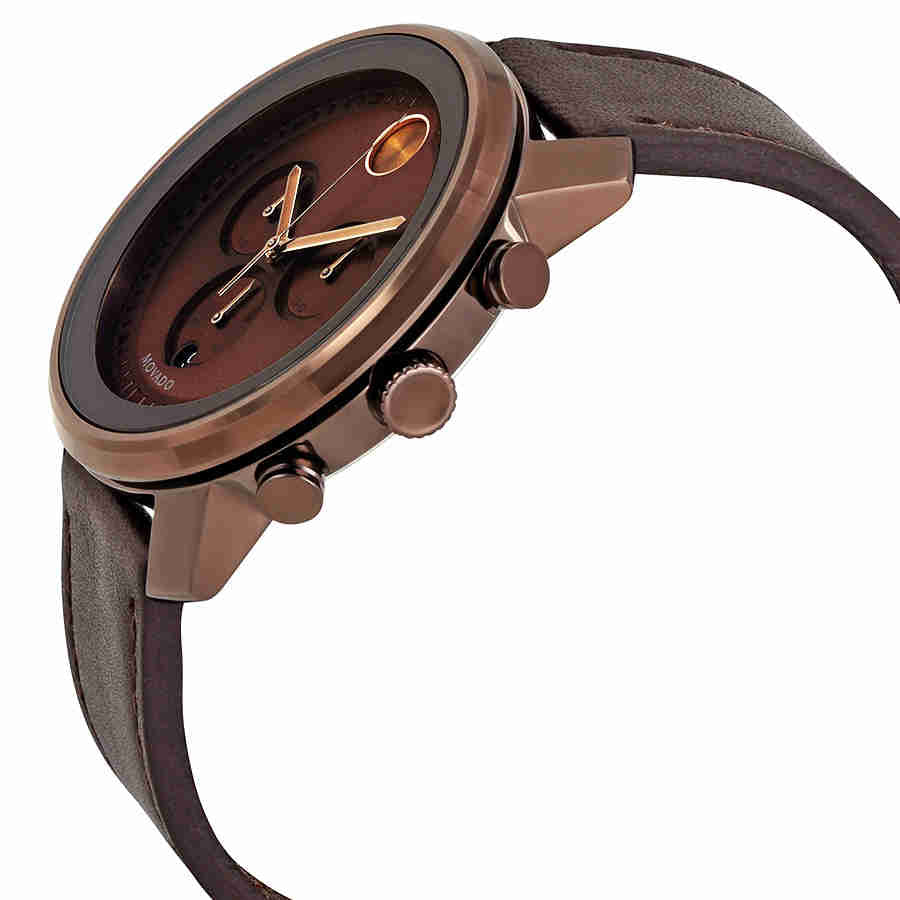Brown ion-plated stainless steel case with a brown leather strap. Fixed brown ion-plated bezel. Brown dial with brown hands and index hour markers. Minute markers around the outer rim. The Movado dot marks the 12 o'clock position. Dial Type: Analog. Date display above the 6 o'clock position. Chronograph - three sub-dials displaying: 60 second, 30 minute and 12 hour. Quartz movement. Scratch resistant K1 mineral crystal. Push / pull crown. Solid case back. Case size: 44 mm. Round case shape. Band width: 22 mm. Tang clasp. Water resistant at 30 meters / 100 feet. Functions: chronograph, date, hour, minute, second. Casual watch style. Movado Bold Chronograph Brown Dial Mens Watch 3600420.