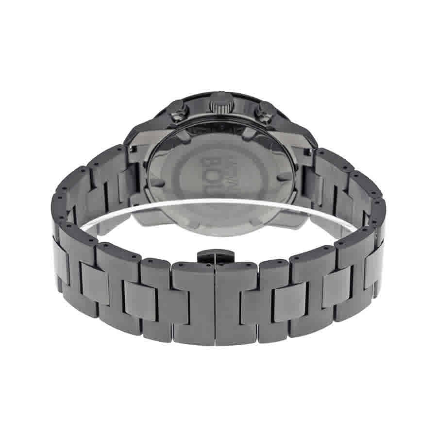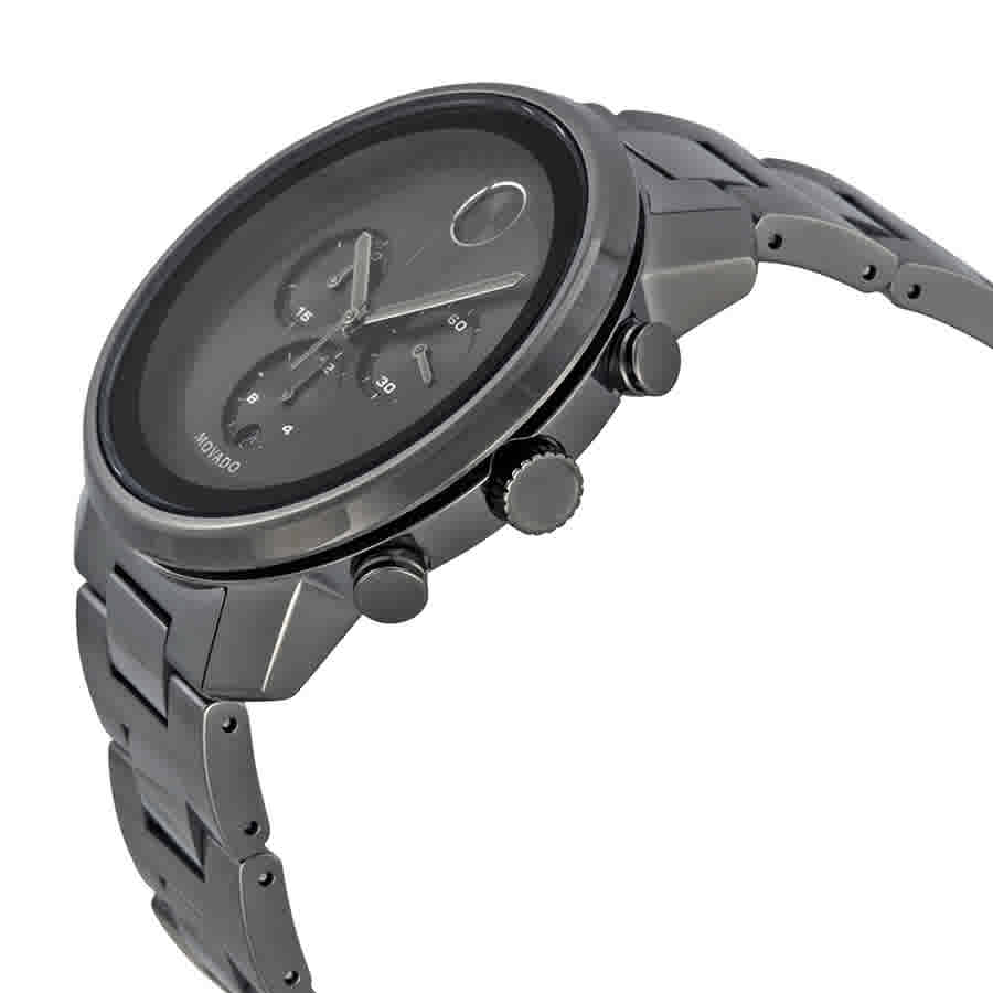 Gunmetal-plated stainless steel case and bracelet. Fixed gunmetal ion-plated bezel. Grey sunray dial with grey hands and index hour markers. Minute markers around the outer rim. The Movado dot appears at the 12 o'clock position. Dial Type: Analog. Luminescent hands and markers. Date display at the 6 o'clock position. Chronograph - three sub-dials displaying: 60 seconds, 30 minute and 12 hour. Quartz movement. Scratch resistant sapphire crystal. Solid case back. Case diameter: 44 mm. Round case shape. Deployment clasp with push button release. Water resistant at 30 meters / 100 feet. Functions: hour, minute, second. Dress watch style. Movado Bold Grey Sunray Dial Stainless Steel Band and Case Mens Watch 3600277.