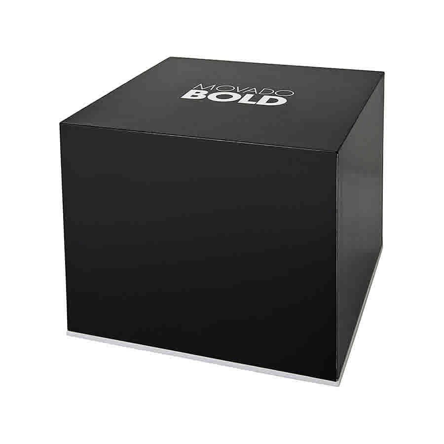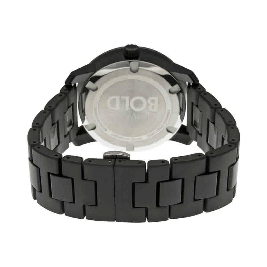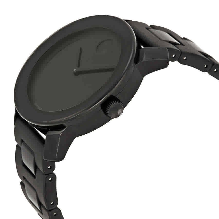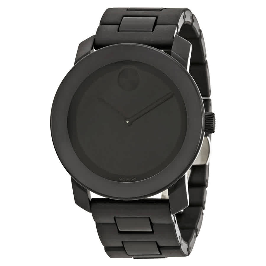 Black TR90 composite material case with a TR90 composite material bracelet. Black TR90 composite bezel. Black dial with black hands. No markers. The signature Movardo dot appears at the 12 o'clock position. Dial Type: Analog. Quartz movement. Scratch resistant mineral crystal. Solid case back. Case diameter: 42 mm. Round case shape. Deployment clasp. Water resistant at 30 meters/ 100 feet. Functions: hours, minutes. Casual watch style. Watch label: Swiss Made. Movado Bold 42 mm Movado Bold 42 mm Large Black Dial Black TR90 Composite Mens Watch 3600047