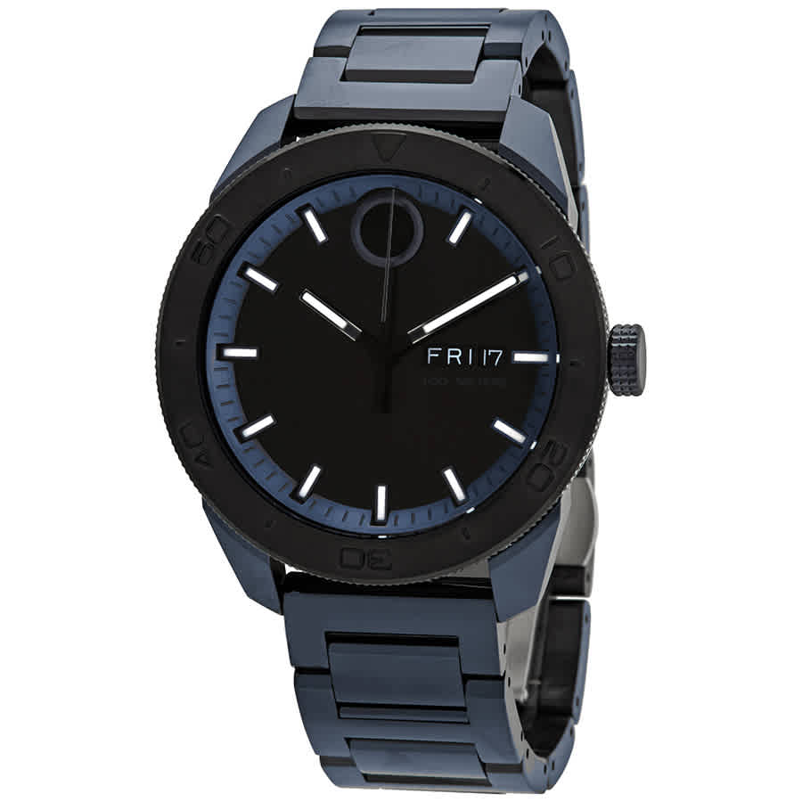 Blue IP tr90- stainless steel case with a blue IP stainless steel bracelet. Fixed bezel. Black-blue dial with blue hands and index hour markers. Dial Type: Analog. Day of the week and date display at the 3 o'clock position. Quartz movement. Scratch resistant k1 crystal. Pull / push crown. Solid case back. Round case shape. Case size: 43.5 mm. Water resistant at 100 meters / 330 feet. Functions: date, day, hour, minute, second. Casual watch style. Movado Bold Quartz Mens Stainless Steel Watch 3600607.