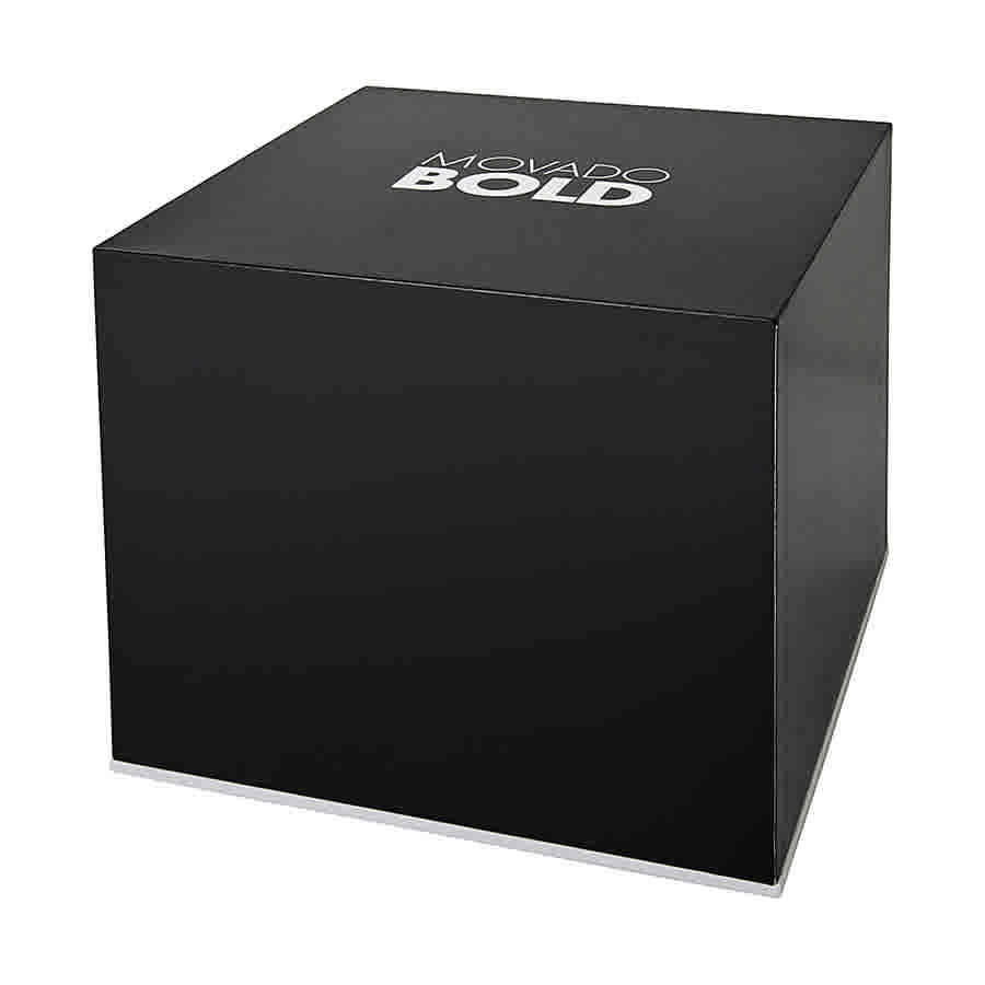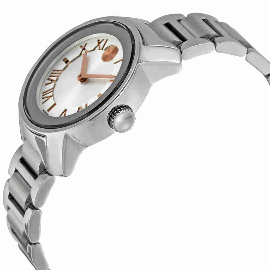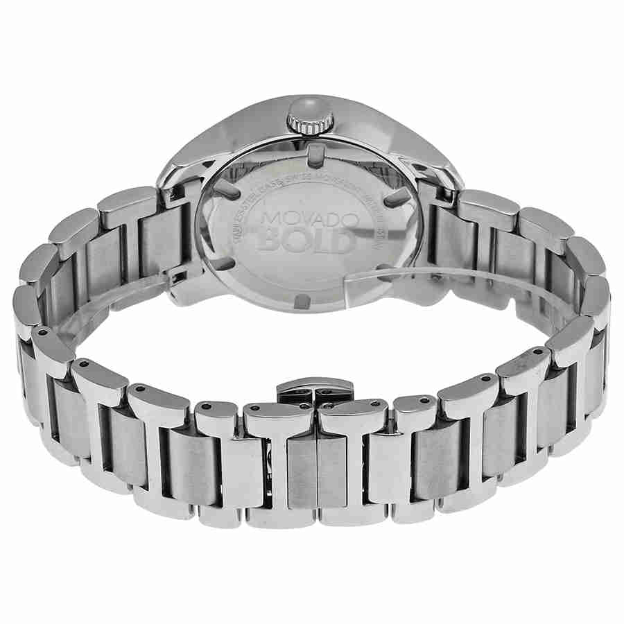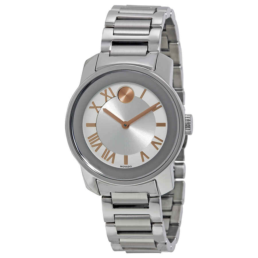 Stainless steel case with a stainless steel bracelet. Fixed stainless steel bezel. Silver dial with rose gold-tone hands and Roman numeral hour markers. The Movado dot marks the 12 o'clock position. Dial Type: Analog. Quartz movement. Scratch resistant K1 crystal. Pull / push crown. Solid case back. Case diameter: 32 mm. Round case shape. Deployment clasp. Water resistant at 30 meters / 100 feet. Functions: hour, minute. Sport watch style. Movado Bold Quartz Silver Dial Stainless Steel Ladies Watch 3600244.