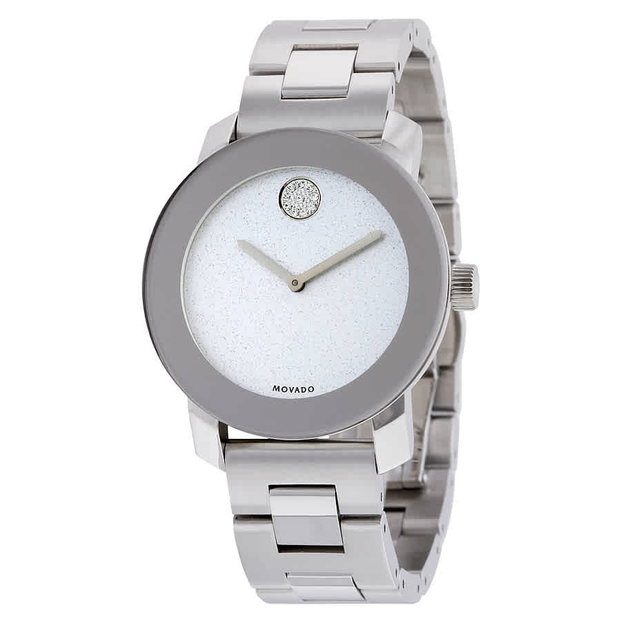 Stainless steel case with a stainless steel bracelet. Fixed stainless steel bezel. Silver dial with silver-tone hands. No markers. Crystalized Movado dot marks the 12 o'clopck position. Dial Type: Analog. Quartz movement. Scratch resistant K1 mineral crystal. Pull / push crown. Solid case back. Case size: 36 mm. Case thickness: 12 mm. Round case shape. Band width: 23 mm. Band length: 8 inches. Deployment clasp. Water resistant at 30 meters / 100 feet. Functions: hour, minute. Dress watch style. Movado Bold Silver Dial Stainless Steel Ladies Watch 3600334.