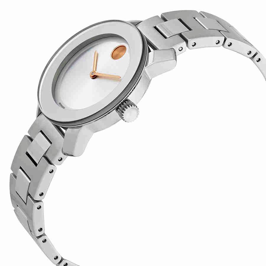 Stainless steel case with a stainless steel bracelet. Fixed stainless steel bezel. Silver sunray dial with rose gold-tone hands. No markers. The Movado dot appears at the 12 o'clock position. Dial Type: Analog. Quartz movement. Scratch resistant mineral K1 crystal. Pull / push crown. Solid case back. Round case shape. Case size: 30 mm. Case thickness: 7.4 mm. Band width: 19 mm. Deployment clasp with a push button release. Water resistant at 30 meters / 100 feet. Functions: hour, minute. Dress watch style. Movado Bold Silver Sunray Dial Stainless Steel Ladies Watch 3600433.