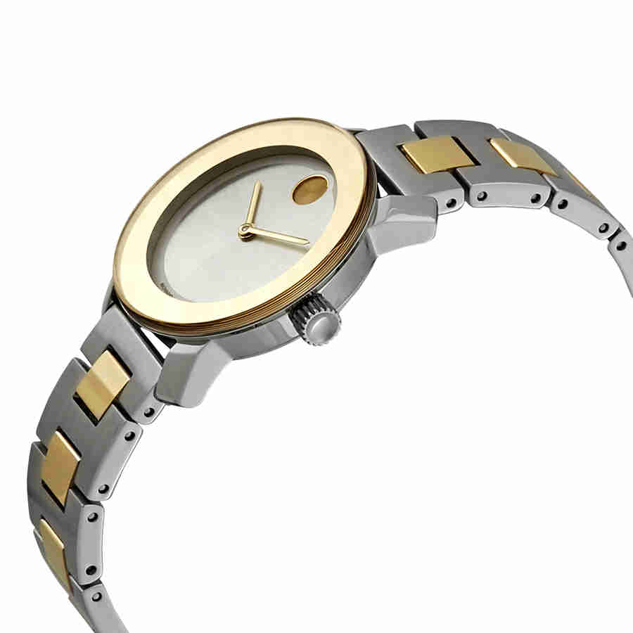 Silver-tone stainless steel case with a silver-tone/yellow gold-tone stainless steel two-tone bracelet. Fixed yellow gold-tone stainless steel bezel. Silver-toned sunray dial with yellow gold-tone hands and dot at 12 o'clock hour markers. Dial Type: Analog. Quartz movement. Scratch resistant k1 crystal. Solid case back. Round case shape. Case size: 30 mm. Deployment clasp. Water resistant at 30 meters / 100 feet. Functions: hour, minute. Casual watch style. Movado Bold Silver-Tone Sunray Dial Ladies Two-Tone Watch 3600551.