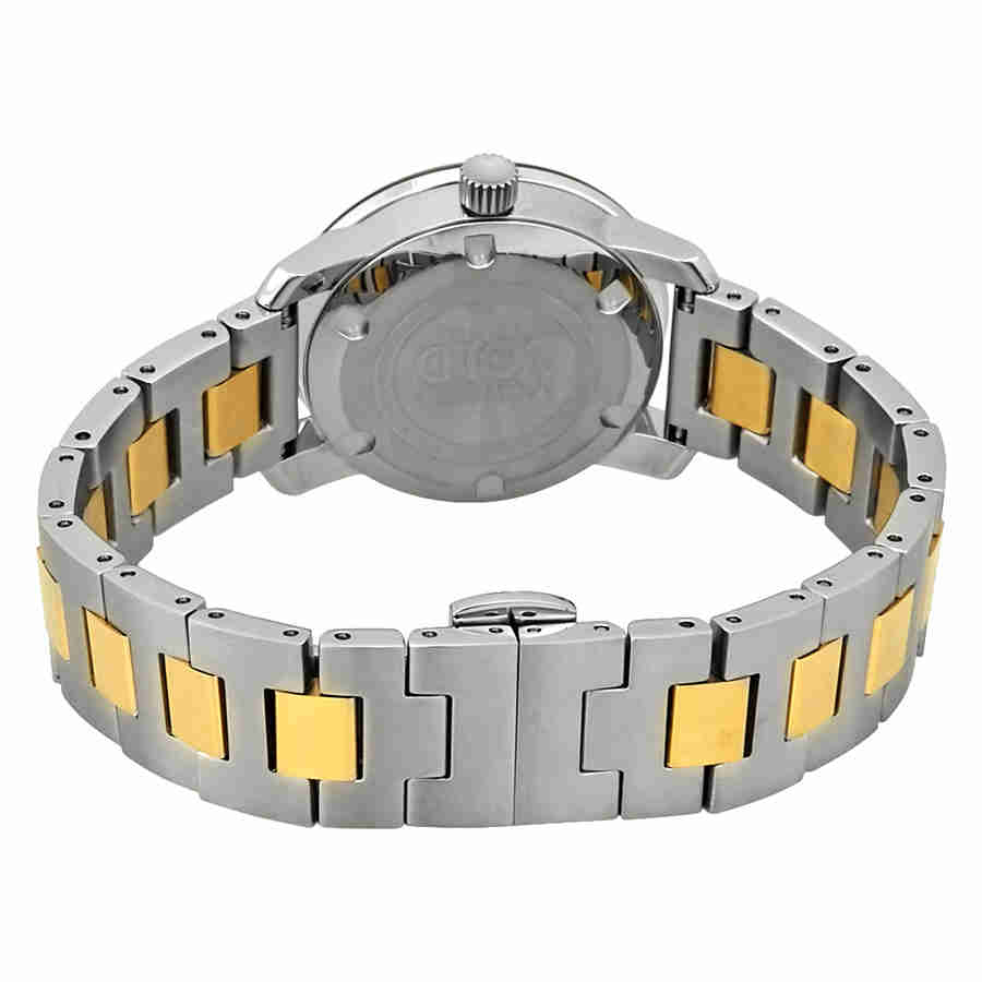 Silver-tone stainless steel case with a silver-tone/yellow gold-tone stainless steel two-tone bracelet. Fixed yellow gold-tone stainless steel bezel. Silver-toned sunray dial with yellow gold-tone hands and dot at 12 o'clock hour...