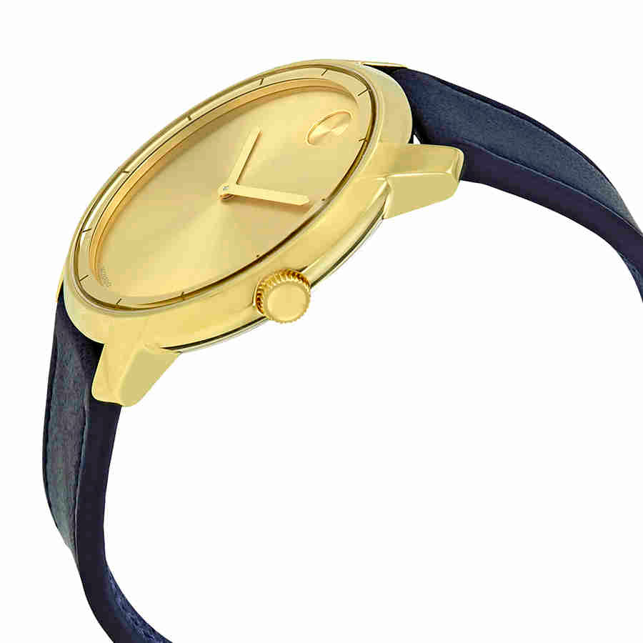 Yellow gold ion-plated stainless steel case with a navy leather strap. Fixed yellow gold ion-plated stainless steel bezel. Yellow gold sunray dial with yellow gold-tone hands and index hour markers. The Movado dot marks the 12 o'clock position. Dial Type: Analog. Quartz movement. Scratch resistant K1 crystal. Pull / push crown. Solid case back. Case size: 44 mm. Round case shape. Water resistant at 30 meters / 100 feet. Functions: hour, minute. Casual watch style. Movado Bold Yellow Gold Sunray Dial Mens Watch 3600469.