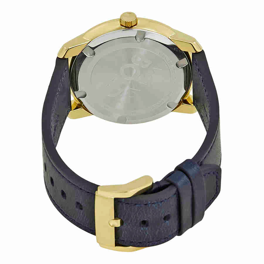Yellow gold ion-plated stainless steel case with a navy leather strap. Fixed yellow gold ion-plated stainless steel bezel. Yellow gold sunray dial with yellow gold-tone hands and index hour markers. The...
