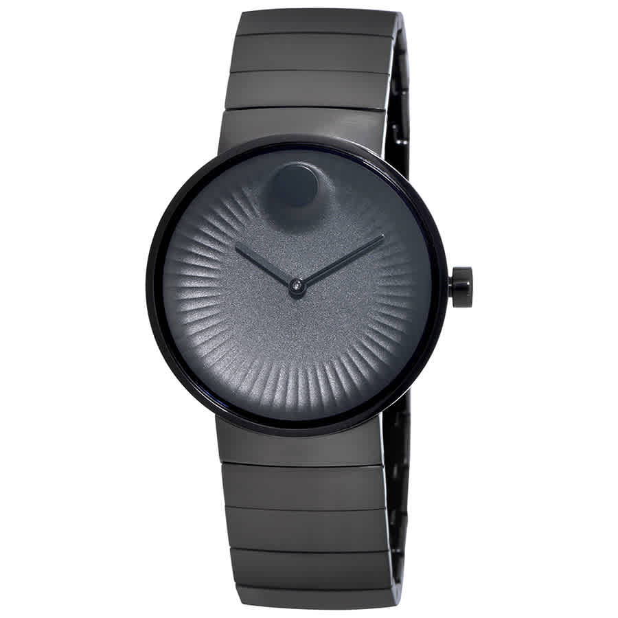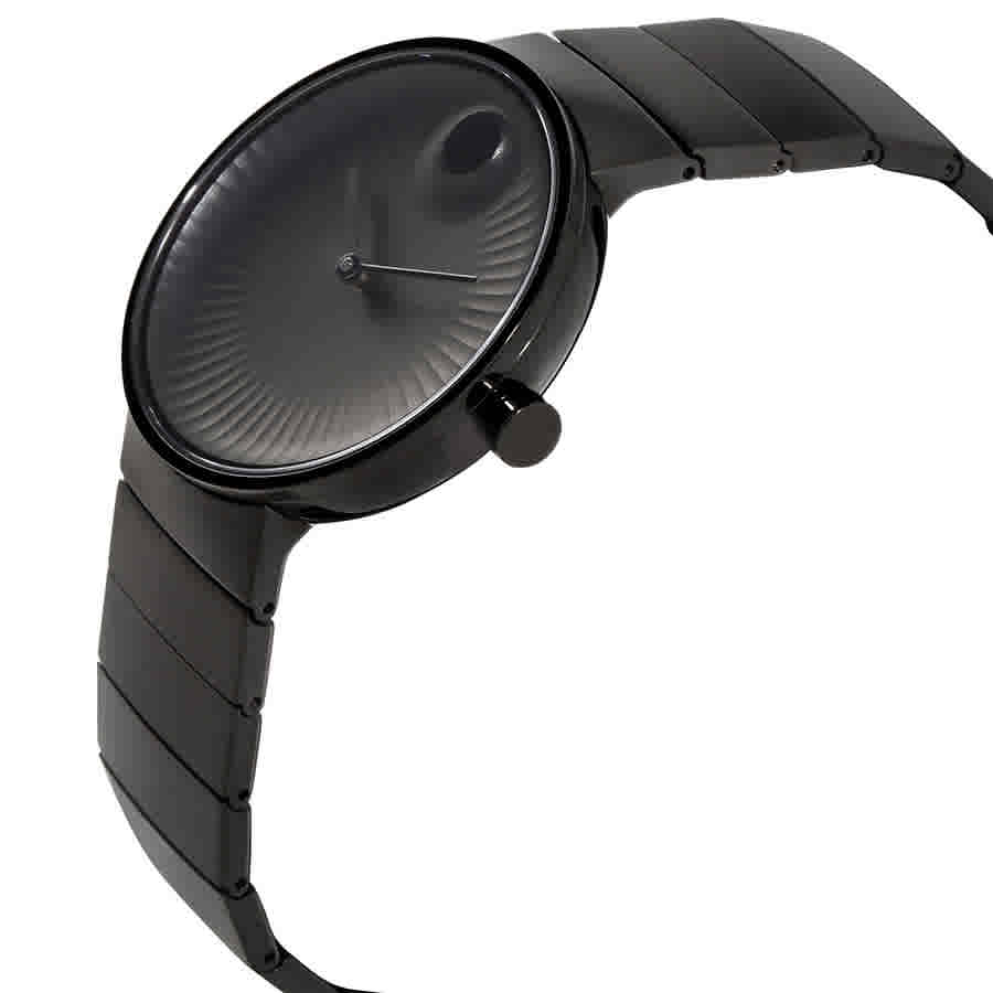 Black ion-plated stainless steel case and bracelet. Fixed black ion-plated bezel. Concave sandblasted black aluminum dial with black hands. No markers. Movado dot appears at the 12 o'clock position. Dial Type:...
