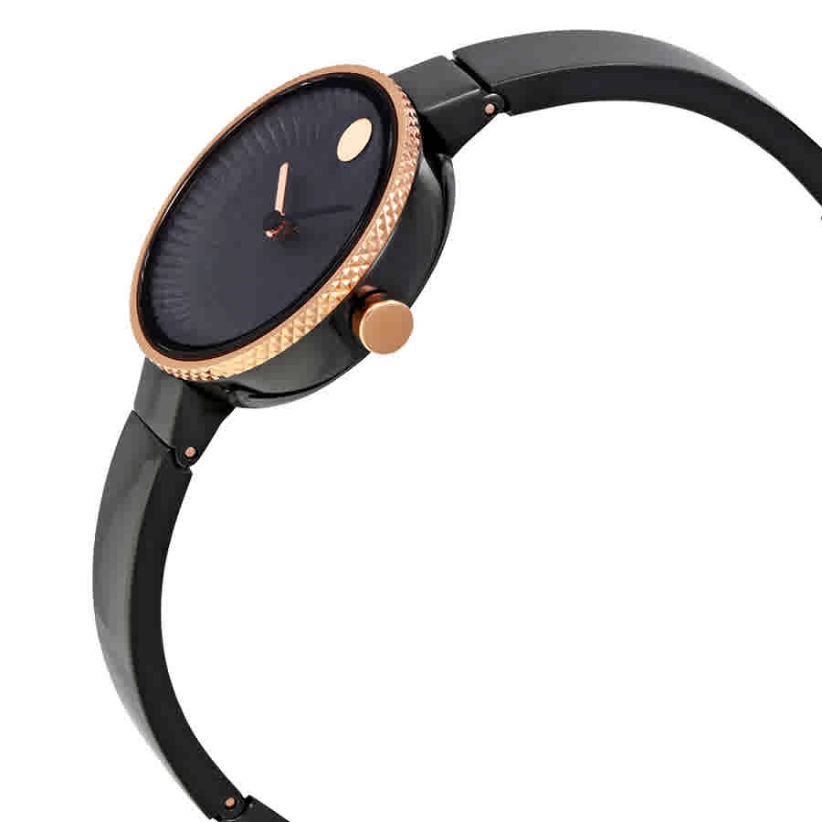 Black IP stainless steel case with a black IP stainless steel bangle bracelet. Fixed gold-tone IP stainless steel bezel. Concave black lava-textured dial with black and gold-tone hands and the signature Movado dot appears at the 12 o'clock position. Dial Type: Analog. Quartz movement. Scratch resistant sapphire crystal. Pull / push crown. Engraved yves behar signature case back. Round case shape. Case size: 28 mm. Jewelry clasp. Water resistant at 30 meters / 100 feet. Functions: hour, minute. Dress watch style. Watch label: Swiss Made. Movado Edge Black Lava Textured Dial Ladies Watch 3680025.