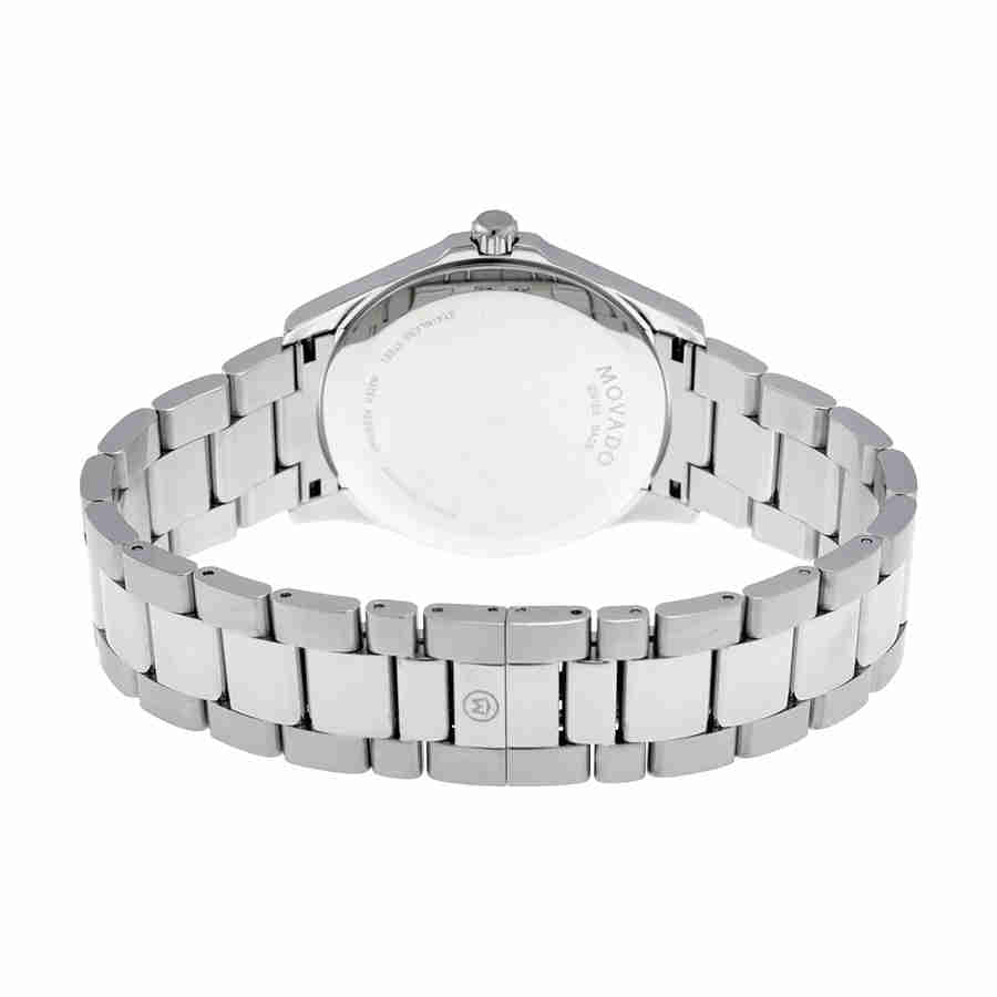 Silver-tone stainless steel case with a silver-tone stainless steel bracelet. Fixed silver-tone stainless steel bezel. Blue dial with silver-tone dauphine-style shape hands and the signature Movado dot appears at the 12...