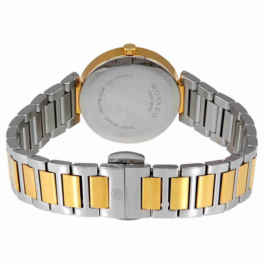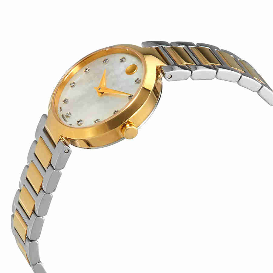 Yellow gold PVD stainless steel case with a two-tone (silver and yellow gold PVD) stainless steel bracelet. Fixed yellow gold PVD bezel. Mother of pearl dial with gold-tone hands and diamond hour markers. The Movado dot appears at the 12 o'clock position. Dial Type: Analog. Quartz movement. Scratch resistant sapphire crystal. Solid case back. Round case shape. Case size: 28 mm. Deployment clasp with a push button release. Water resistant at 30 meters / 100 feet. Functions: hour, minute. Additional Info: dial set with 11 diamond markers (0.042 t.c.w.). Dress watch style. Watch label: Swiss Made. Movado Modern Classic Mother of Pearl Diamond Dial Ladies Watch 0607103.