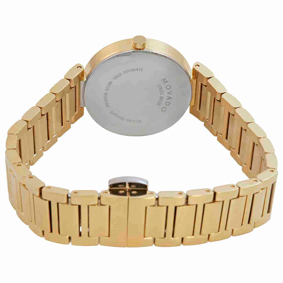 Yellow gold PVD stainless steel case and bracelet. Fixed yellow gold PVD stainless steel bezel. Mother of pearl dial with gold-tone hands and diamond hour markers. The Movado dot makers the 12 o'clock position. Dial Type: Analog. Quartz movement. Scratch resistant sapphire crystal. Pull / push crown. Solid case back. Round case shape. Case size: 28 mm. Band width: 15.9 mm. Deployment clasp with a push button release. Water resistant at 30 meters / 100 feet. Functions: hour, minute. Dress watch style. Watch label: Swiss Made. Movado Modern Classic Mother of Pearl Diamond Dial Ladies Watch 0607105.