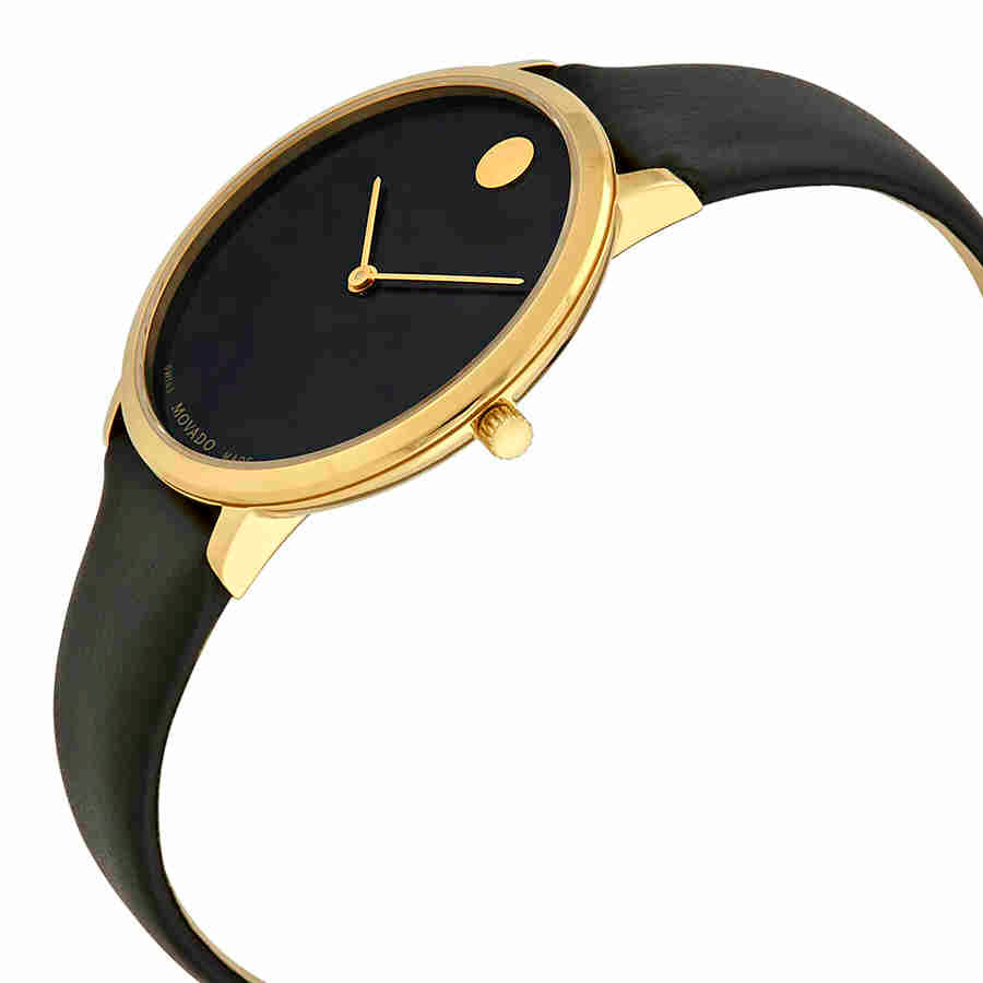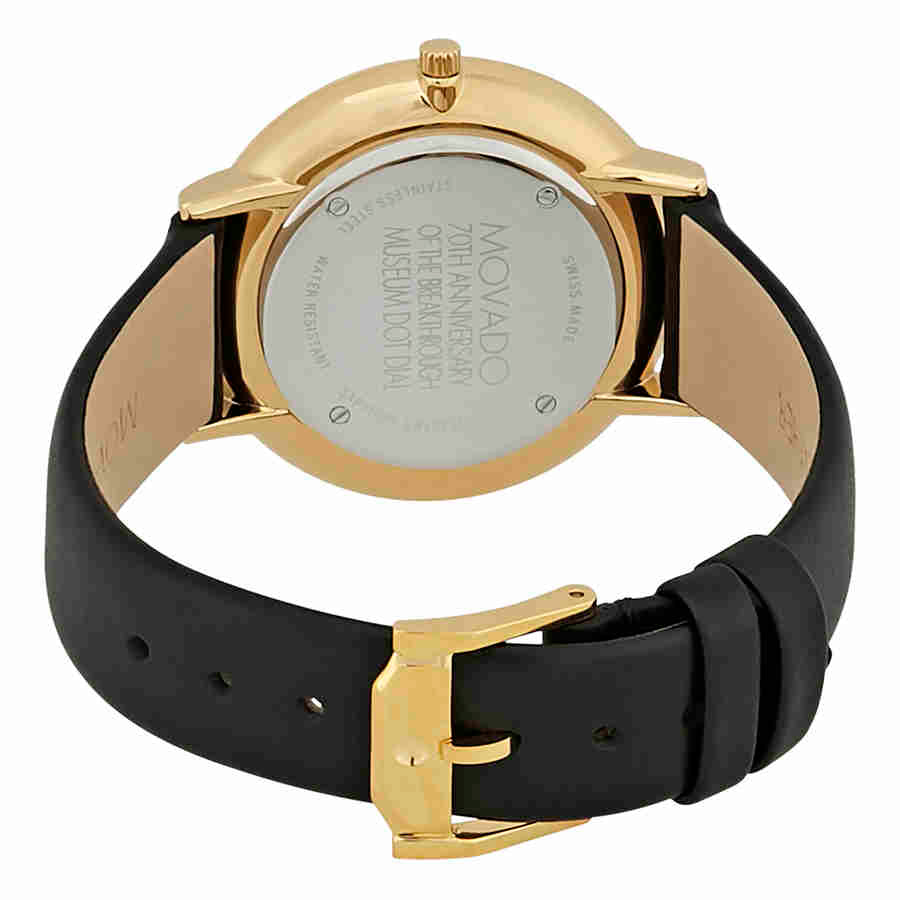 Yellow gold PVD stainless steel case with a black leather strap. Fixed yellow gold PVD stainless steel bezel. Black dial with yellow gold-tone hands. No markers. movado dot marks the 12 o'clock position. Dial Type: Analog. Quartz movement. Scratch resistant sapphire crystal. Pull / push crown. Solid case back. Round case shape, case size: 35 mm, case thickness: 5.85 mm. Band width: 17 mm. Tang clasp. Water resistant at 30 meters / 100 feet. Functions: hour, minute. Dress watch style. Watch label: Swiss Made. Movado Museum 70th Anniversary Black Dial Ladies Watch 0607137.