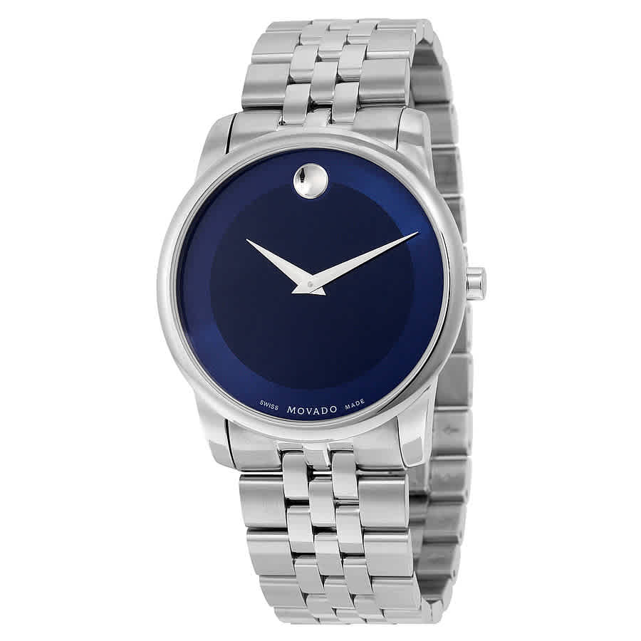 Stainless steel case with a stainless steel bracelet. Fixed stainless steel bezel. Metallic blue dial with silver-tone hands. No markers. The Movado dot appears at the 12 o'clock position. Dial Type: Analog. Quartz movement. Scratch resistant sapphire crystal. Pull / push crown. Solid case back. Case diameter: 40 mm. Cae thickness: 10 mm. Round case shape. Bracelet width: 18 mm. Deployment clasp. Water resistant at 30 meters / 100 feet. Functions: hour, minute. Dress watch style. Watch label: Swiss Made. Movado Museum Quartz Metallic Blue Dial Stainless Steel Mens Watch 0606982.