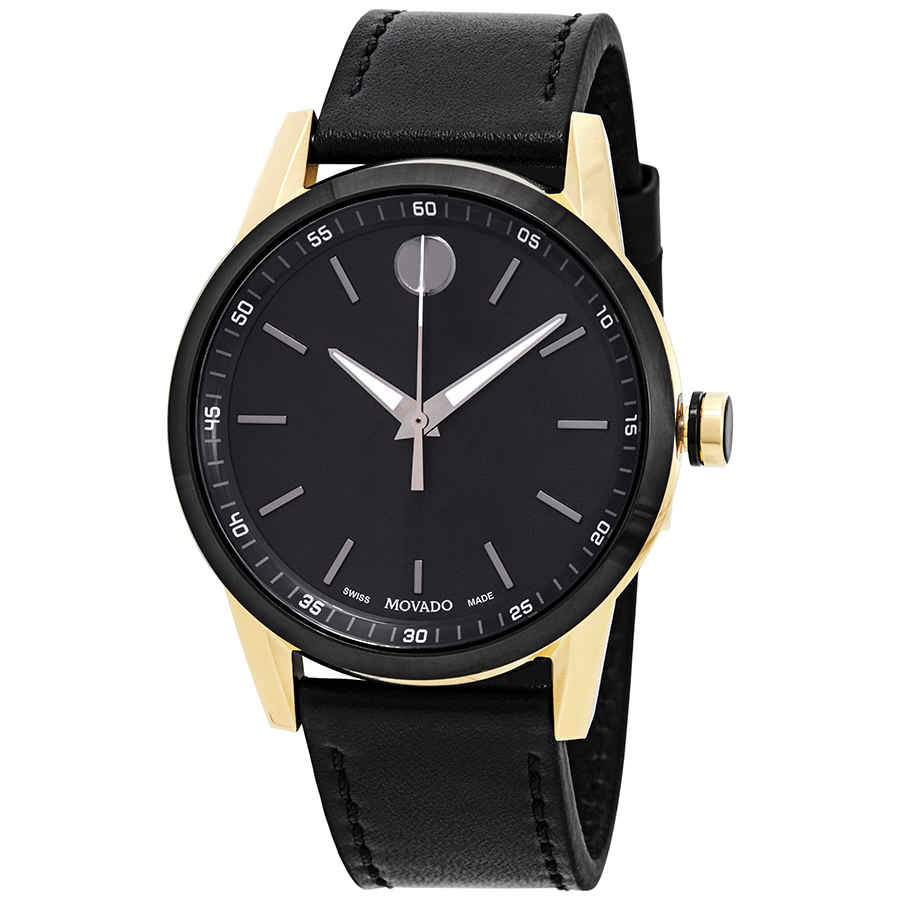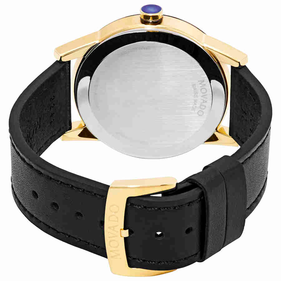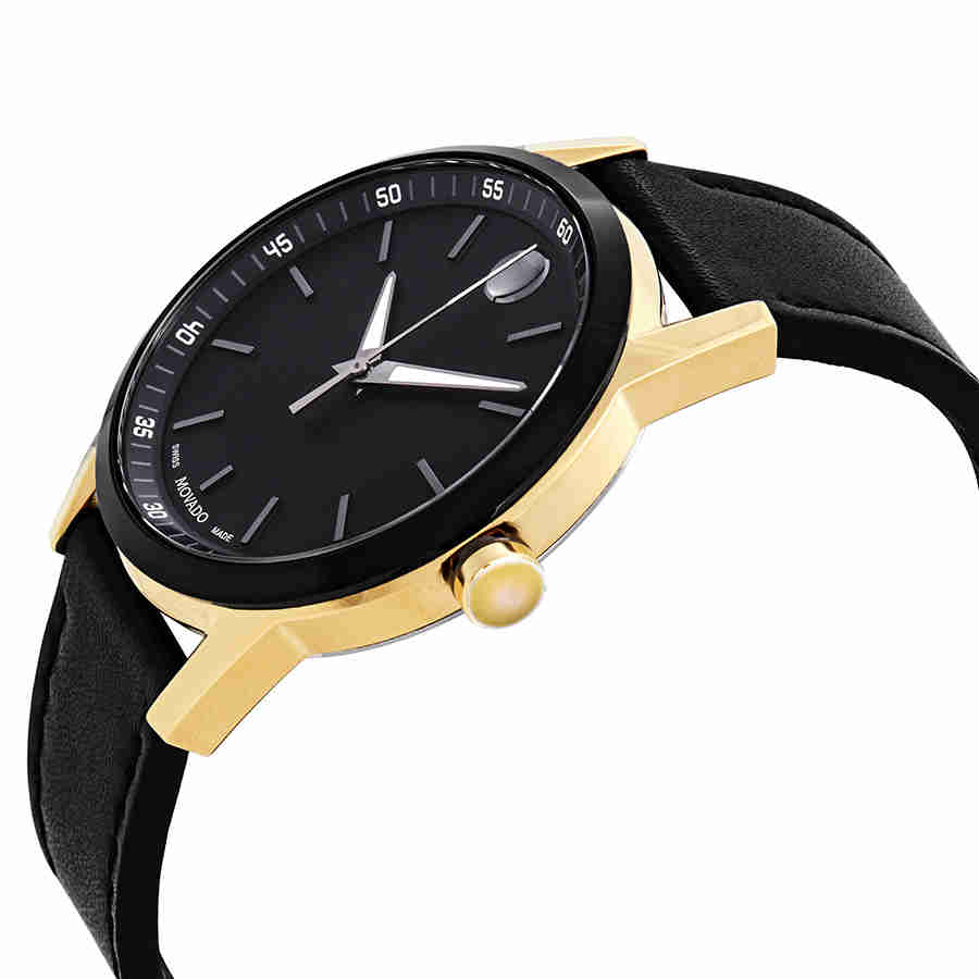 Yellow gold PVD stainless steel case with a black (calfskin) leather strap. Fixed black PVD bezel. Black dial with luminous grey hands and index hour markers. Arabic numeral minute markers (at 5 minute intervals). Minute markers around the outer rim. The Movado dot appears at the 12 o'clock position. Dial Type: Analog. Luminescent hands. Quartz movement. Scratch resistant sapphire crystal. Pull / push crown. Solid case back. Round case shape. Case size: 42 mm. Tang clasp. Water resistant at 30 meters / 100 feet. Functions: hour, minute, second. Casual watch style. Watch label: Swiss Made. Movado Museum Sport Black Dial Mens Watch 0607223.