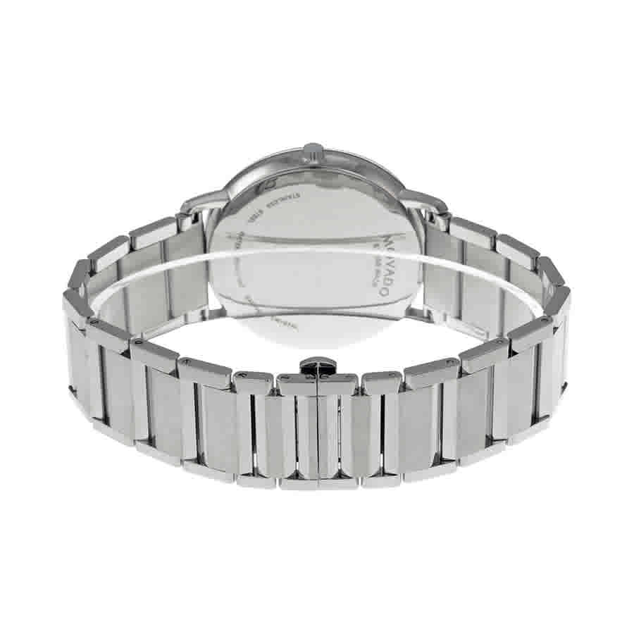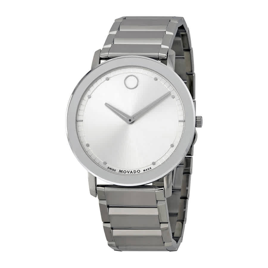 Stainless steel case with a stainless steel bracelet. Fixed stainless steel bezel. Silver soleil dial with silver-tone hands and index hour markers. Minute markers around the outer rim. the movado dot appears at the 12 o'clock position. Dial Type: Analog. Quartz movement. Scratch resistant sapphire crystal. Pull / push crown. Solid case back. Case size: 40 mm. Case thickness: 5.55 mm. Round case shape. Band width: 22 mm. Band length: 8 inches. Deployment with push button release clasp. Water resistant at 30 meters / 100 feet. Functions: hour, minute. Dress watch style. Watch label: Swiss Made. Movado Sapphire Silver Dial Steel Bracelet Mens Watch 0606881.