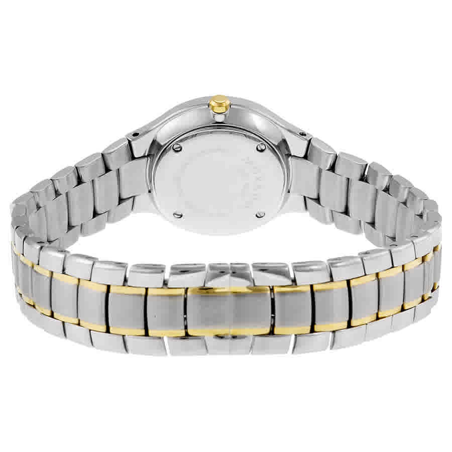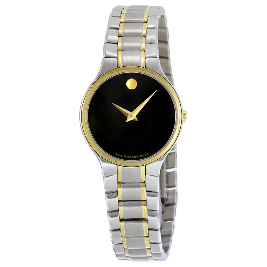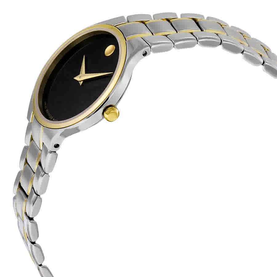 Silver-tone and yellow gold PVD stainless steel case with a silver-tone and yellow gold PVD stainless steel bracelet. Fixed gold-tone bezel. Black dial with gold-tone hands. Signature movado concave dot marks...