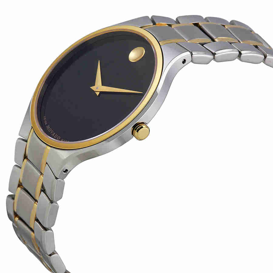 Two-tone stainless steel case with a two-tone stainless steel bracelet. Fixed gold-tone bezel. Black dial with gold-tone hands. No markers. The signature Movado concave dot appears at the 12 o'clock position.. Dial Type: Analog. Swiss quartz movement. Eta 955.102 engine. Scratch resistant sapphire crystal. Solid case back. Case diameter: 38 mm. Case thickness: 8 mm. Band length: Men's Standard. Deployment clasp. Water resistant at 30 meters/ 100 feet. Functions: hours, minutes. Dress watch style. Watch label: Swiss Made. Movado Serio Mens Watch 0606388.