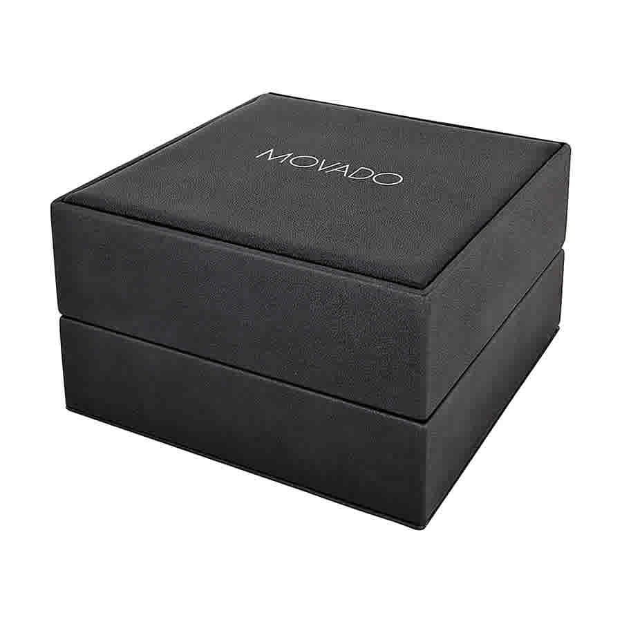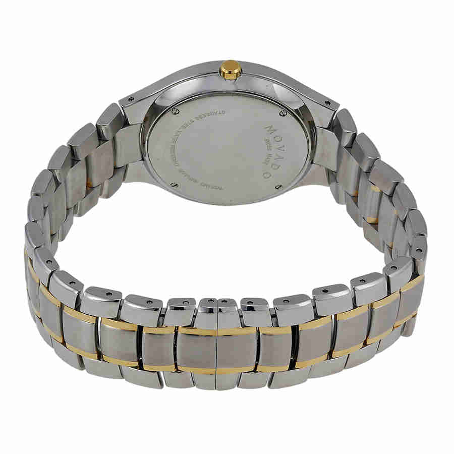 Two-tone stainless steel case with a two-tone stainless steel bracelet. Fixed gold-tone bezel. Black dial with gold-tone hands. No markers. The signature Movado concave dot appears at the 12 o'clock position.....