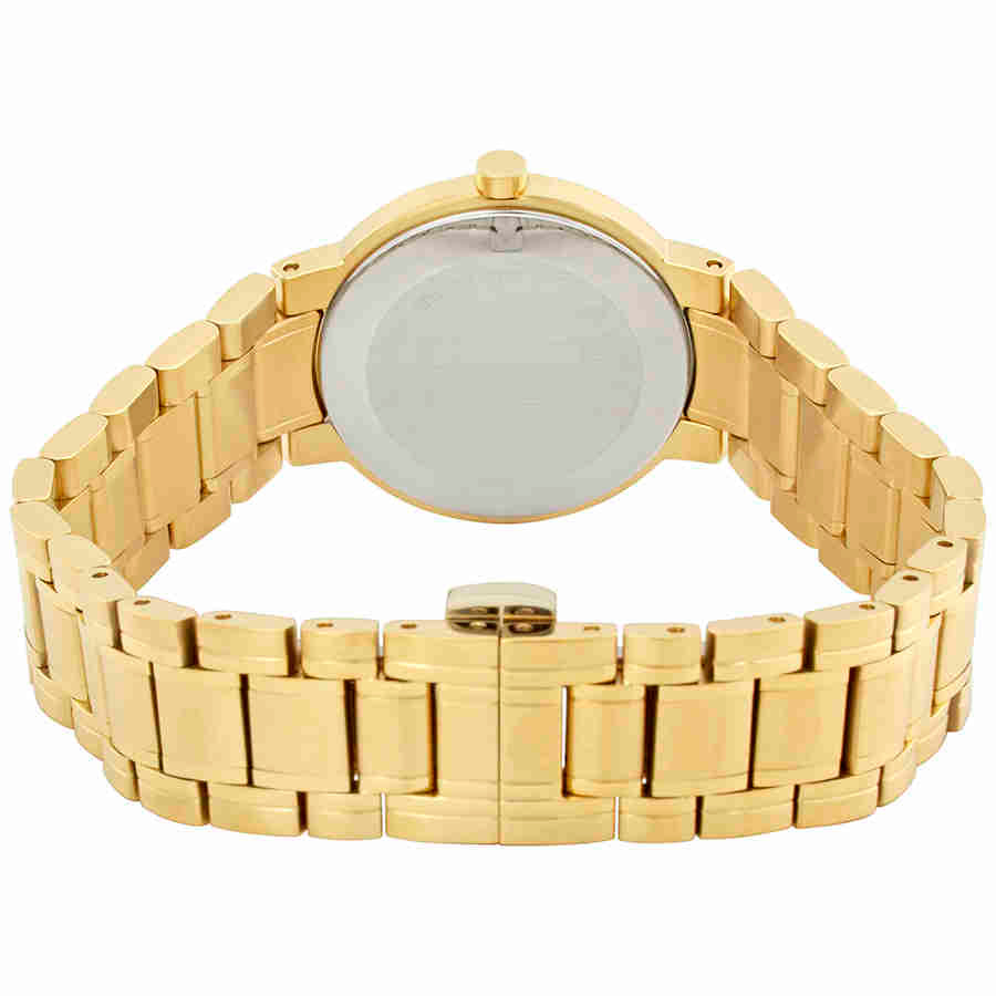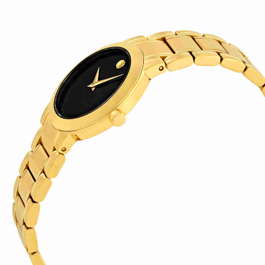 Yellow gold PVD stainless steel case and bracelet. Fixed yellow gold PVD bezel. Black dial with yellow gold-tone hands. No markers. The Movado dot appears at the 12 o'clock position. Dial...