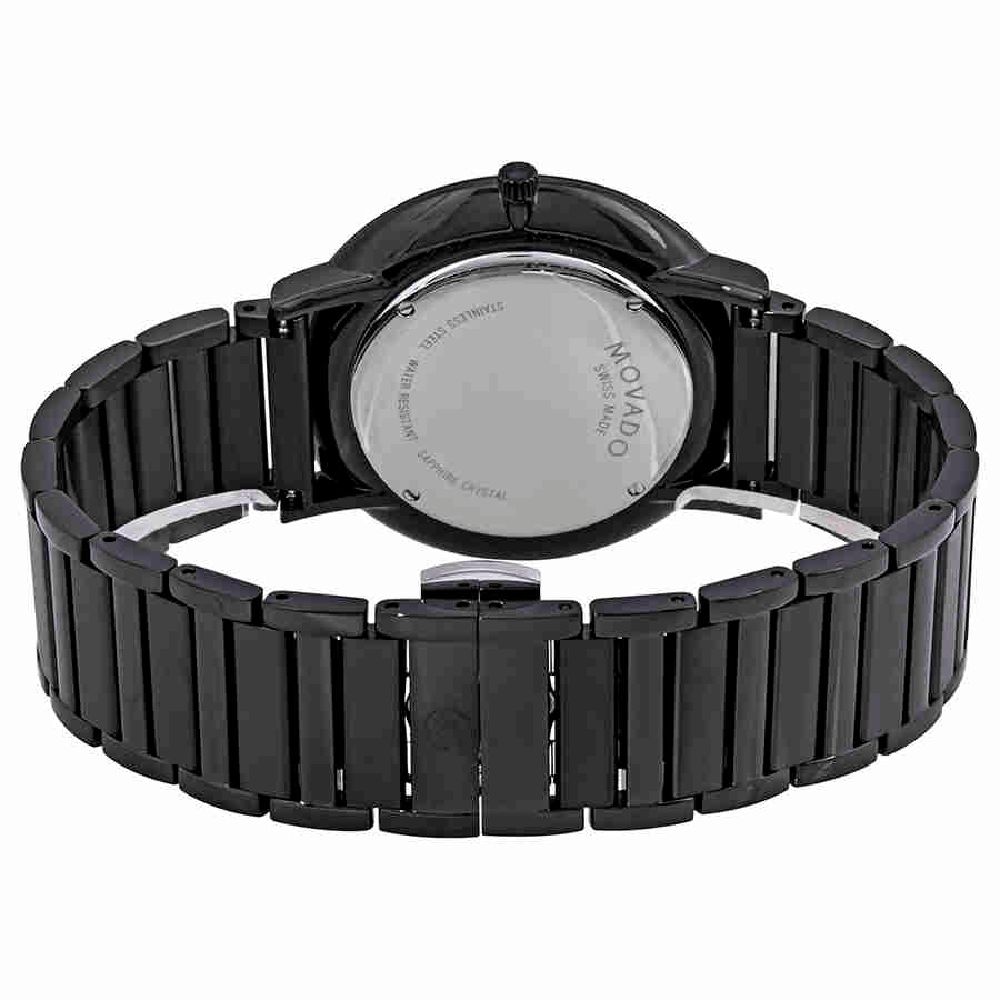 Black PVD stainless steel case and bracelet. Fixed black PVD bezel. Black dial with silver-tone hands and index hour markers. The Movado dot appears at the 12 o'clock position. Dial Type:...