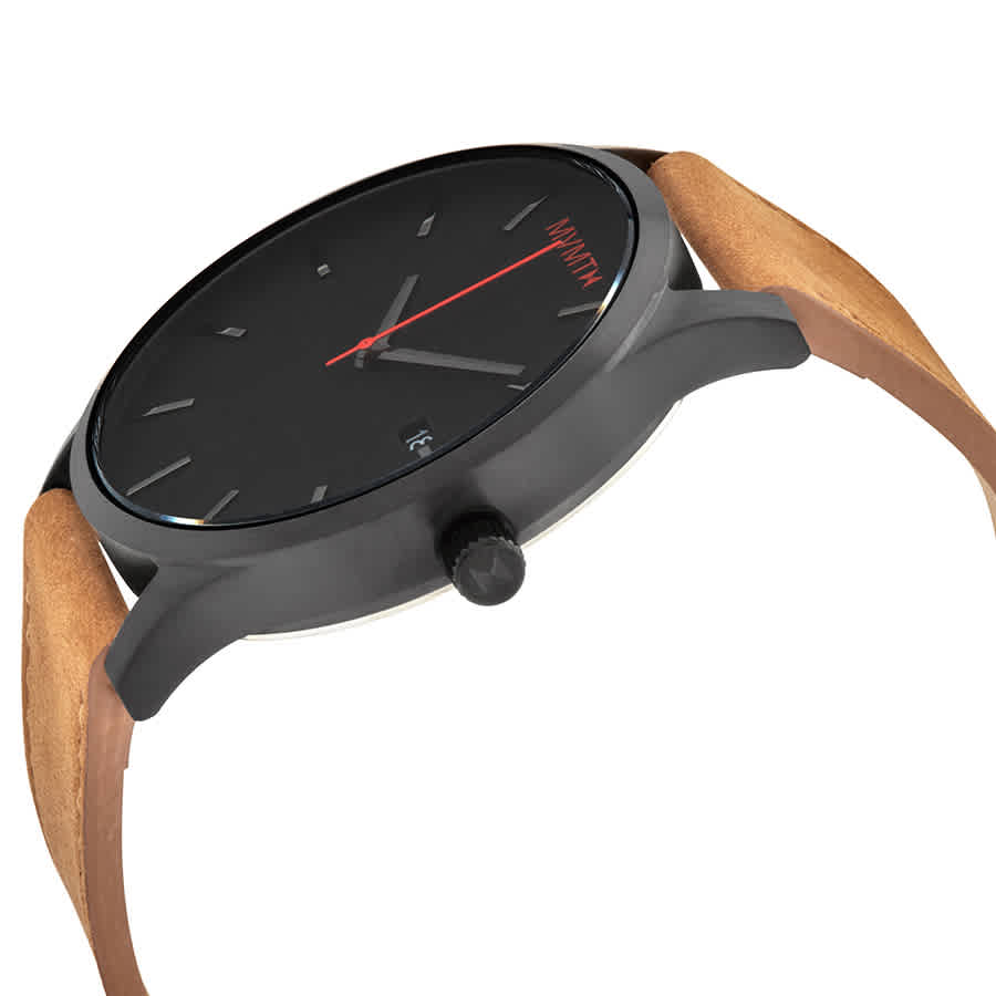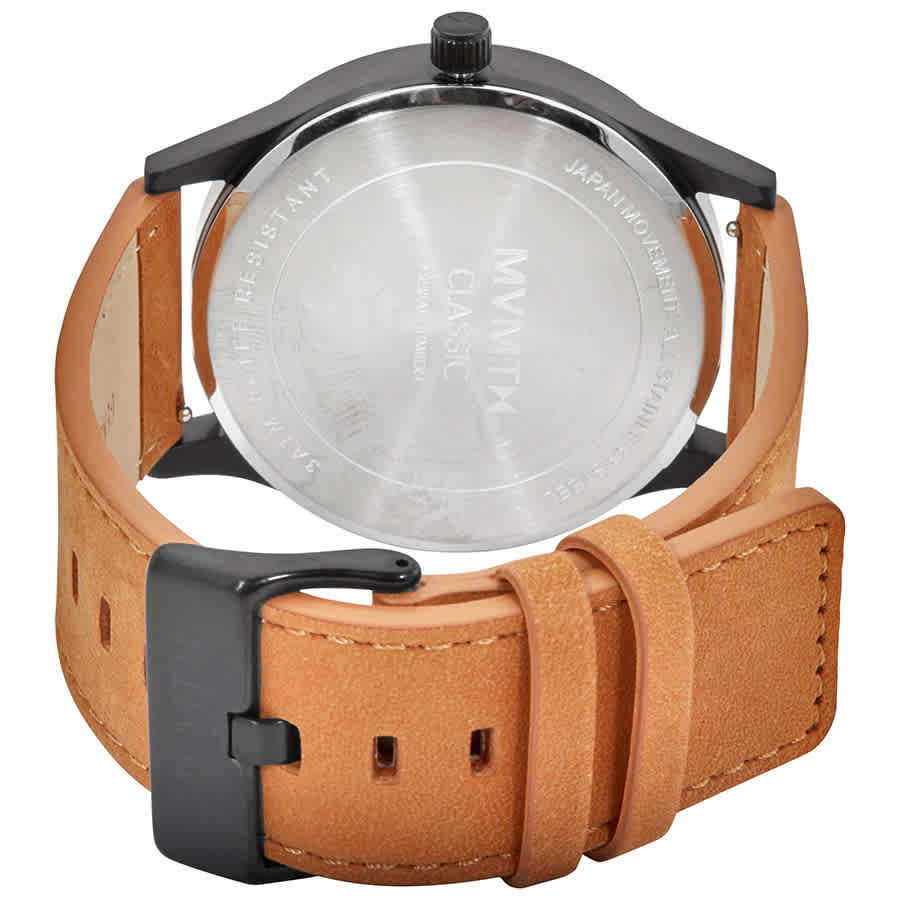 Black ion-plated stainless steel case with a tan leather strap. Fixed black ion-plated bezel. Black dial with black hands and index hour markers. Dial Type: Analog. Date display at the 3 o'clock position. Quartz movement. Scratch resistant mineral crystal. Pull / push crown. Solid case back. Round case shape. Case size: 45 mm. Case thickness: 9 mm. Band width: 24 mm. Tang clasp. Water resistant at 30 meters / 100 feet. Functions: date, hour, minute, second. Casual watch style. MVMT Classic Casual Black Dial Mens Watch L213.5L.351.
