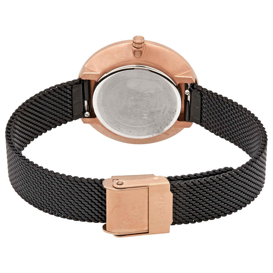 Rose gold-tone brushed stainless steel case with a black PVD stainless steel mesh bracelet. Fixed rose gold-tone bezel. Black dial with rose gold-tone hands and index hour markers. Dial Type: Analog....
