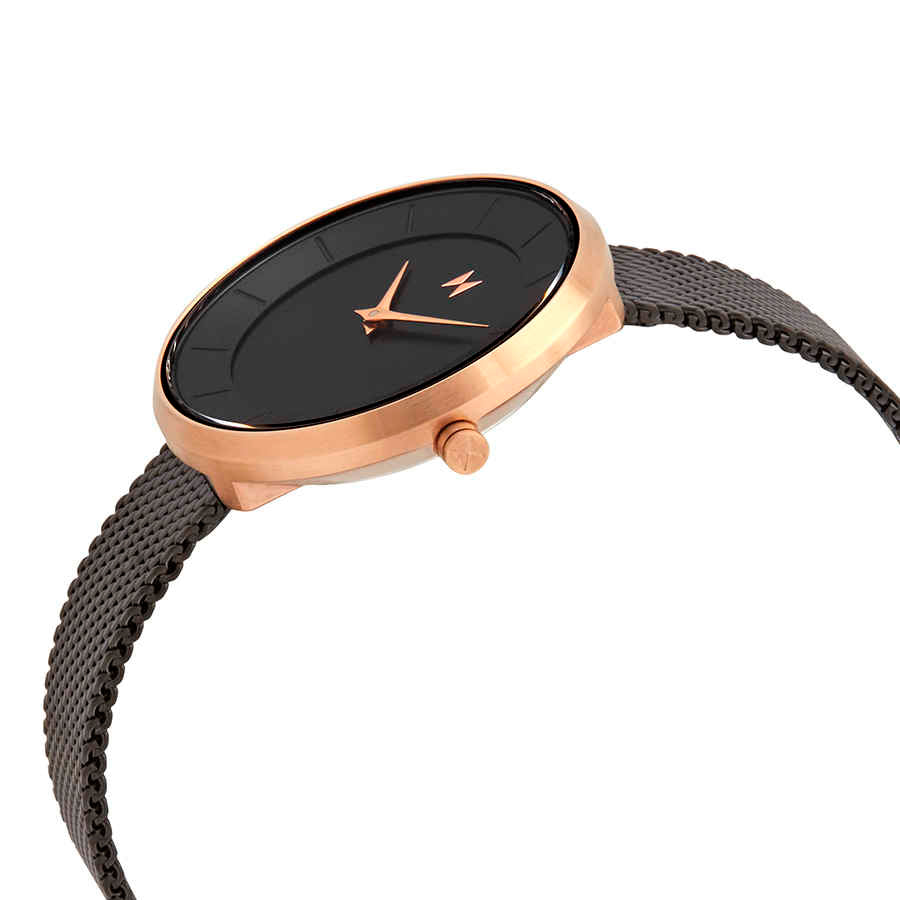 Rose gold-tone brushed stainless steel case with a black PVD stainless steel mesh bracelet. Fixed rose gold-tone bezel. Black dial with rose gold-tone hands and index hour markers. Dial Type: Analog. Quartz movement. Scratch resistant mineral crystal. Pull / push crown. Solid case back. Round case shape. Case size: 32 mm. Case thickness: 7 mm. Band width: 12 mm. Slide through clasp. Water resistant at 50 meters / 165 feet. Functions: hour, minute. Additional Info: perfect for carefree everyday use and can withstand a breif submersion under water, but should not be taken swimming or bathing. Casual watch style. MVMT MOD Quartz Black Dial Ladies Watch FB01-BL.