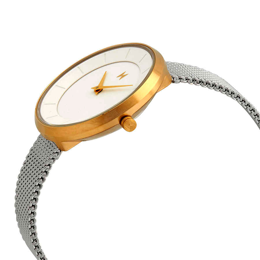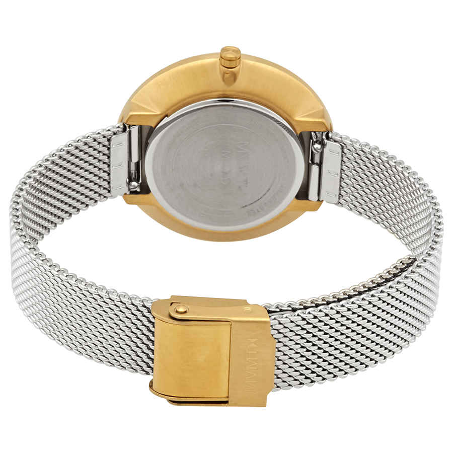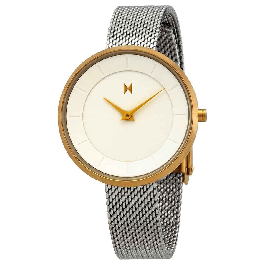 Yellow gold-tone stainless steel case with a stainless steel mesh bracelet. Fixed yellow gold-tone bezel. Silver dial with yellow gold-tone hands and index hour markers. Dial Type: Analog. Quartz movement. Scratch resistant mineral crystal. Pull / push crown. Solid case back. Round case shape. Case size: 32 mm. Case thickness: 7 mm. Band width: 12 mm. Slide through clasp. Water resistant at 50 meters / 165 feet. Functions: hour, minute. Casual watch style. MVMT MOD Quartz Silver Dial Ladies Watch FB01-SG.