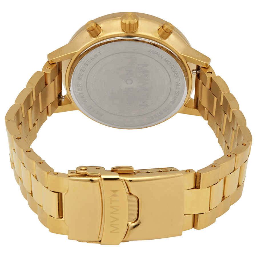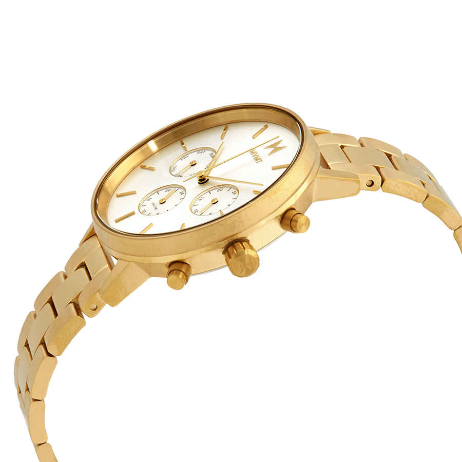 Yellow gold-tone stainless steel case and bracelet. Fixed yellow gold-tone bezel. White dial with yellow gold-tone hands and index hour markers. Dial Type: Analog. Two sub-dials displaying: 24 hour and 24 hour (dual time). Day of the week sub-dial. Quartz movement. Scratch resistant mineral crystal. Pull / push crown. Solid case back. Round case shape. Case size: 38 mm. Case thickness: 10 mm. Band width: 16 mm. Fold over clasp with a safety release. Water resistant at 50 meters / 165 feet. Functions: hour, minute, second, day, dual time. Additional Info: perfect for carefree everyday use and can withstand a breif submersion under water, but should not be taken swimming or bathing. Casual watch style. MVMT Nova Solis Quartz White Dial Ladies Watch FC01-G.