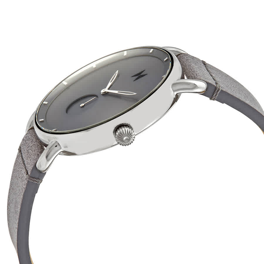 Polished stainless steel case with a grey leather strap. Fixed stainless steel bezel. Grey dial with silver-tone hands and index hour markers. Dial Type: Analog. Small seconds sub-dial. Quartz movement. Scratch resistant mineral crystal. Pull / push crown. Solid case back. Round case shape. Case size: 41 mm. Case thickness: 11 mm. Band width: 20 mm. Tang clasp. Water resistant at 50 meters / 165 feet. Functions: hour, minute, second. Casual watch style. MVMT Revolver Gotham Quartz Grey Dial Mens Watch MR01-SGR.