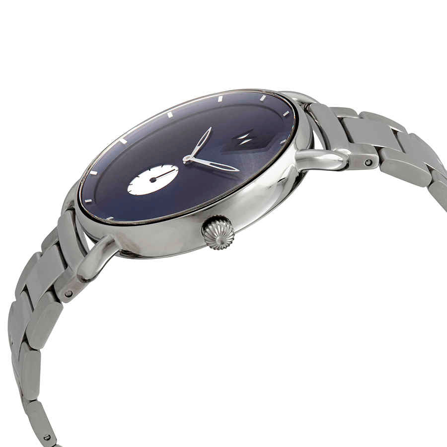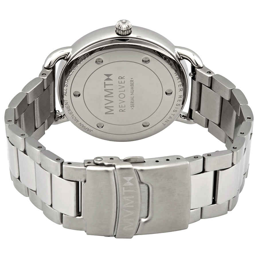 Stainless steel case with a stainless steel bracelet. Fixed stainless steel bezel. Blue dial with silver-tone hands and index hour markers. Dial Type: Analog. White small seconds sub-dial. Quartz movement. Scratch resistant mineral crystal. Pull / push crown. Solid case back. Round case shape. Case size: 41 mm. Case thickness: 11 mm. Band width: 20 mm. Fold over clasp. Water resistant at 50 meters / 165 feet. Functions: hour, minute, second. Casual watch style. MVMT Revolver Quartz Blue Dial Mens Watch MR01-BLUS.