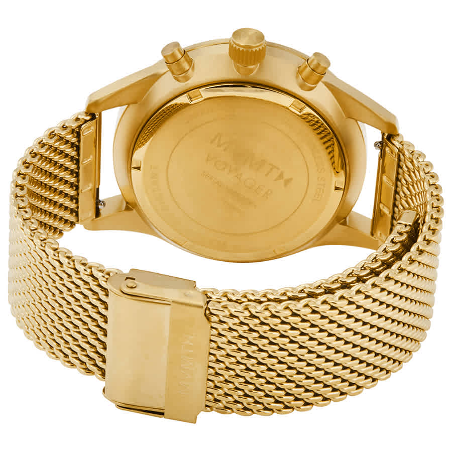 Yellow gold-tone stainless steel case with a yellow gold-tone stainless steel mesh bracelet. Fixed yellow gold-tone bezel. Black dial with yellow gold-tone hands and dot hour markers. Minute markers around the outer rim. Dial Type: Analog. Date display at the 3 o'clock position. Two sub-dials displaying: 24 hours and dual time. Quartz movement. Scratch resistant mineral crystal. Pull / push crown. Solid case back. Round case shape. Case size: 42 mm. Case thickness: 11 mm. Band width: 21 mm. Slide through clasp. Water resistant at 50 meters / 165 feet. Functions: date, hour, minute, second, dual time. Casual watch style. MVMT Voyager Quartz Black Dial Yellow Gold-tone Mens Watch MV01-G2.