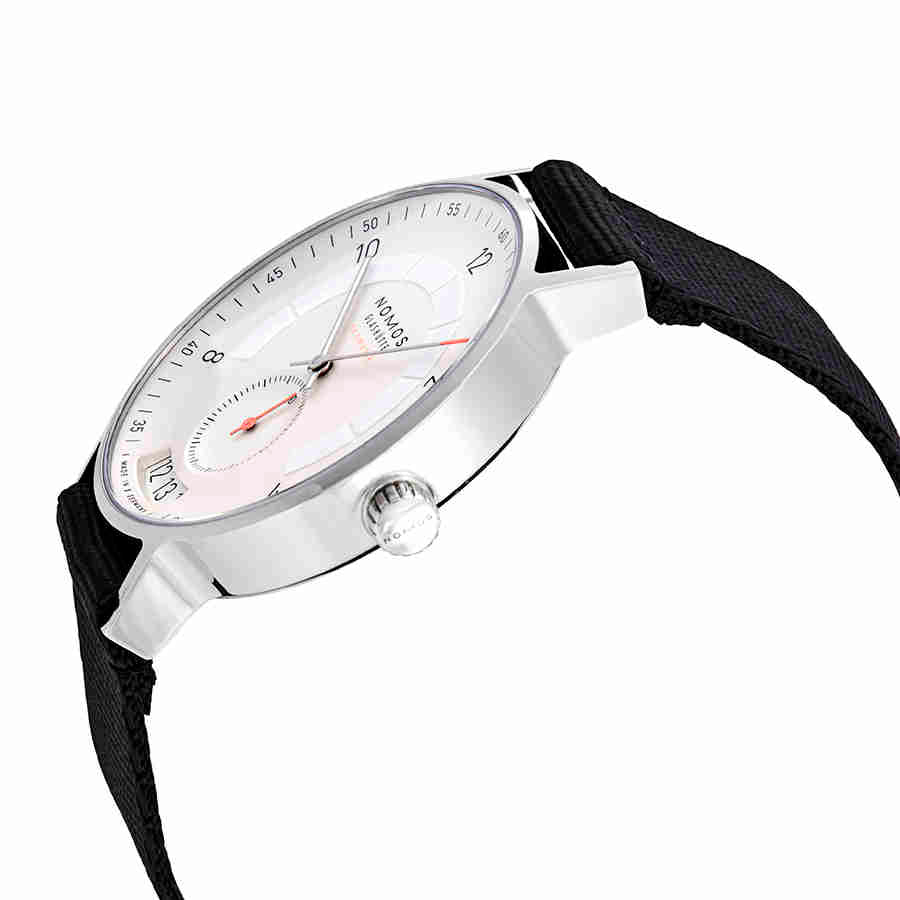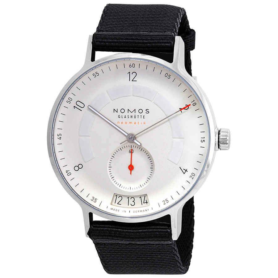 Stainless steel case with a black textile strap. Fixed stainless steel bezel. White silver-plated dial with luminous rhodium-plated hands and Arabic numeral hour markers (at even hour positions). Minute markers around the outer rim. Dial Type: Analog. Luminescent hands. Date display at the 6 o'clock position. Seconds sub-dial above the 6 o'clock position. Nomos calibre DUW 6101 automatic movement with a 42-hour power reserve. Scratch resistant sapphire crystal. Pull / push crown. Transparent case back. Round case shape. Case size: 41 mm. Case thickness: 10.5 mm. Band width: 20 mm. Tang clasp. Water resistant at 100 meters / 330 feet. Functions: date, hour, minute, second. Luxury watch style. Watch label: Made in Germany. Nomos Autobahn Neomatik Automatic Mens Watch 1301.