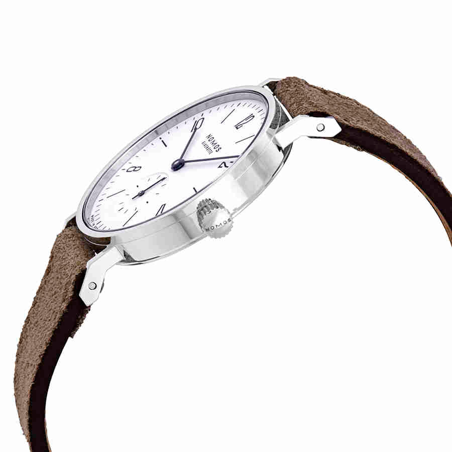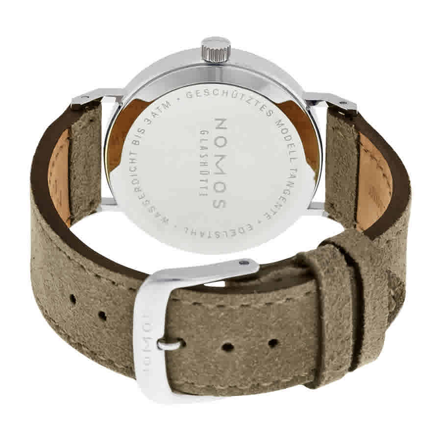 Stainless steel case with a beige (velour) leather strap. Fixed stainless steel bezel. Galvanized, white silver-plated dial with blued steel hands and alternating Arabic numeral and index hour markers. Minute markers...