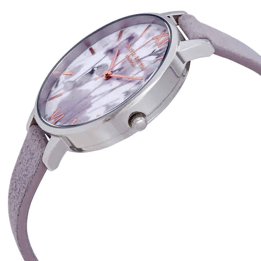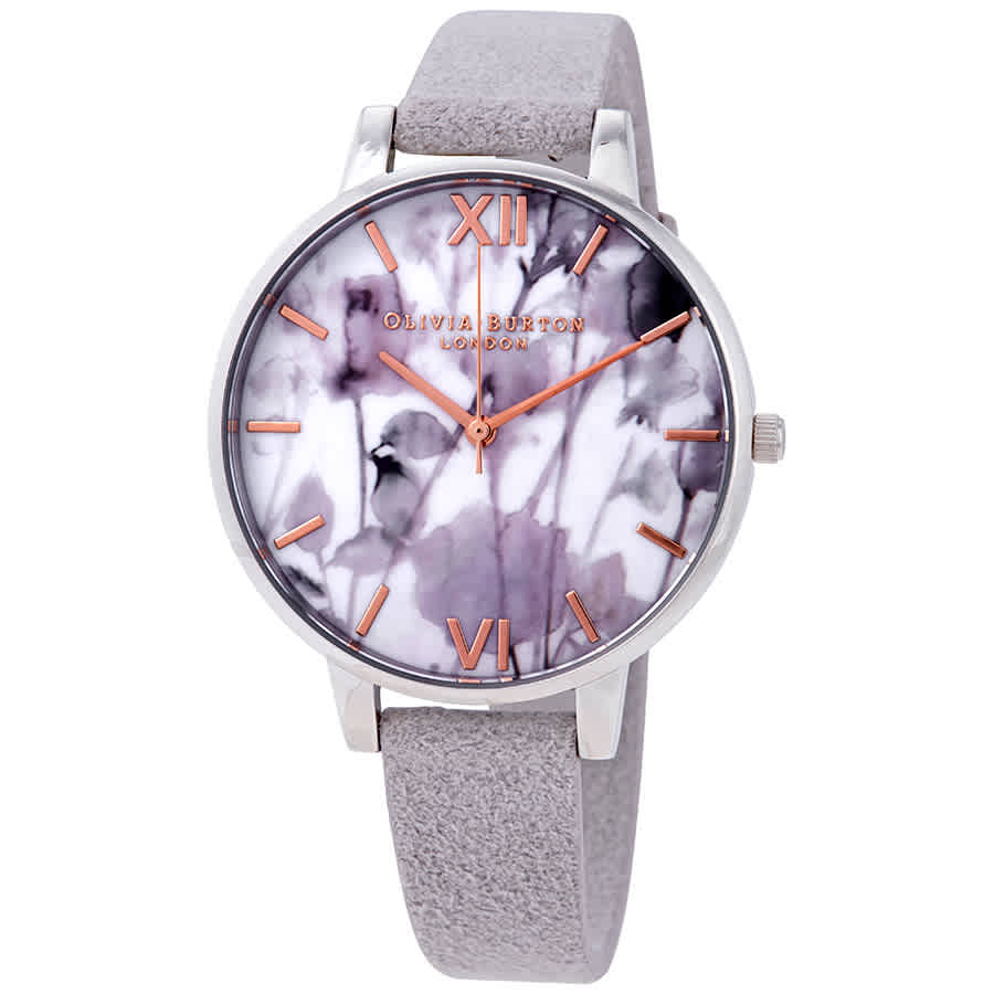 Silver-tone stainless steel case with a grey lilac suede leather strap. Fixed silver-tone stainless steel bezel. Grey dial with rose gold-tone hands and Roman numeral and index hour markers. Dial Type: Analog. Miyota quartz movement. Scratch resistant mineral crystal. Pull / push crown. Solid case back. Round case shape, case size: 38 mm, case thickness: 14 mm. Buckle clasp. Water resistant at 10 meters / 33 feet. Functions: hour, minute, second. Casual watch style. Watch label: Japan Movt. Olivia Burton Eco Friendly Grey Dial Ladies Watch OB16VE13.