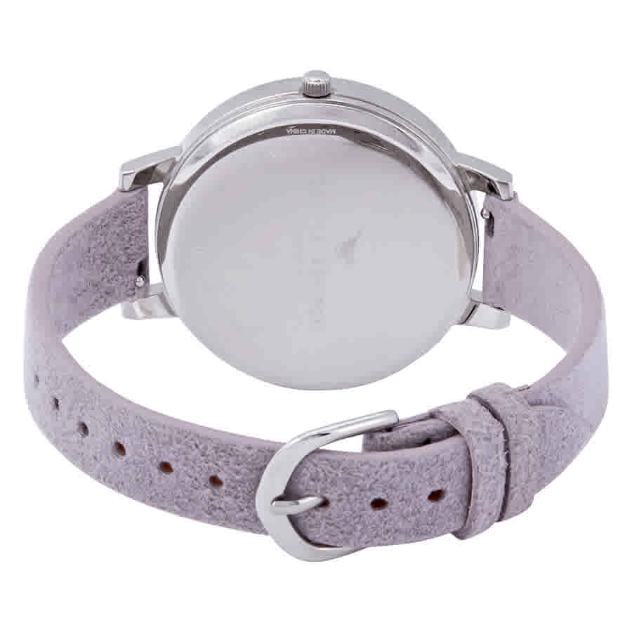 Silver-tone stainless steel case with a grey lilac suede leather strap. Fixed silver-tone stainless steel bezel. Grey dial with rose gold-tone hands and Roman numeral and index hour markers. Dial Type:...
