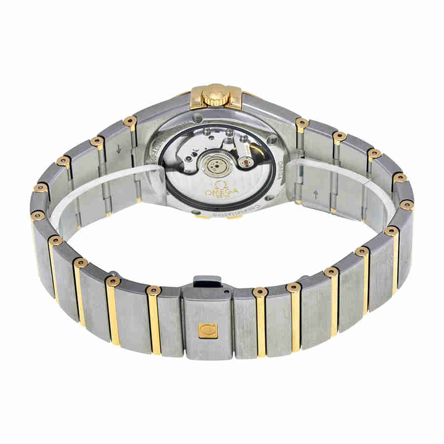 Stainless steel case with a stainless steel bracelet with 18kt yellow gold bars. Fixed 18kt yellow gold bezel. Champagne dial with luminous yellow gold-tone hands and diamonds hour markers. Minute markers around the outer rim. Dial Type: Analog. Luminescent hands. Date display at the 3 o'clock position. Omega calibre 2500 automatic movement with a 48-hour power reserve. Scratch resistant sapphire crystal. Pull / push crown. Skeleton case back. Round case shape. Case size: 35 mm. Case thickness: 10 mm. Band width: 23 mm. Hidden double push button deployment clasp. Water resistant at 100 meters / 330 feet. Functions: date, hour, minute, second, chronometer. Luxury watch style. Watch label: Swiss Made. Item Variations: 123 20 35 20 58 001, 123-20-35-20-58-001, 123/20/35/20/58/001, 12320352058001. Omega Constellation Champagne Dial Unisex Watch 123.20.35.20.58.001.