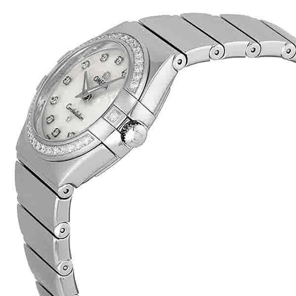 Stainless steel case with a stainless steel bracelet. Fixed silver-tone bezel set with diamonds. Mother of pearl dial with silver-tone hands and diamond hour markers. Dial Type: Analog. Luminescent hands. Quartz...